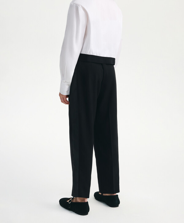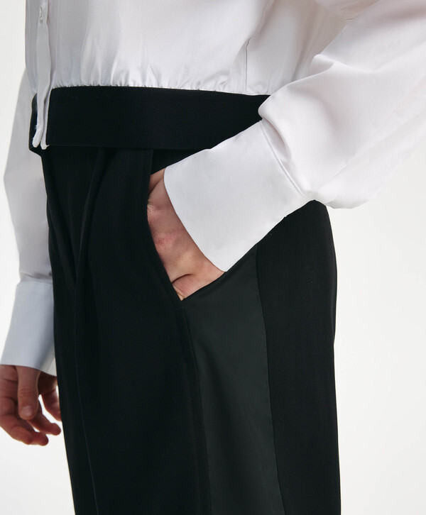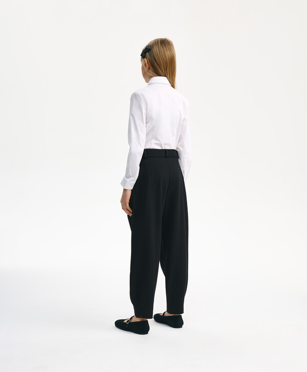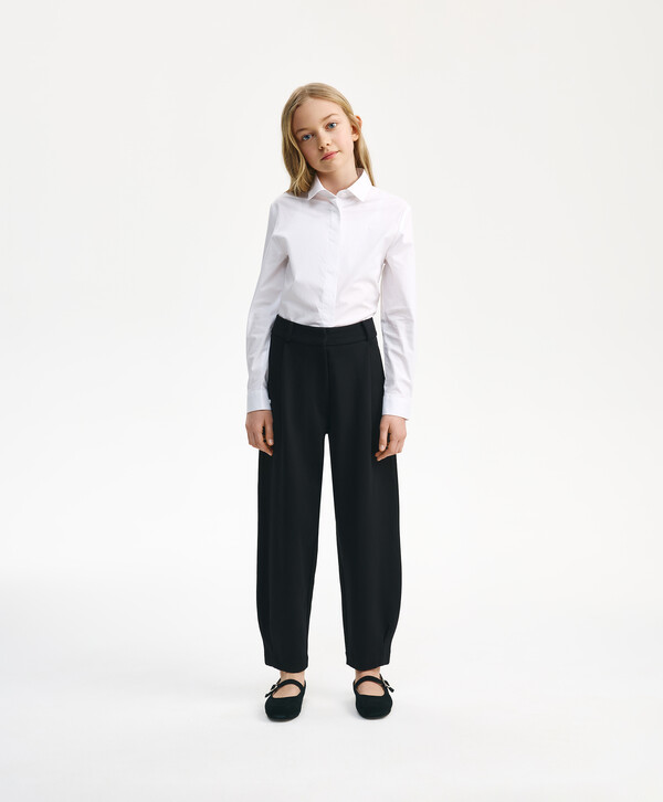 Черные брюки-слоучи (от англ. slouchy - свободные, мешковатые) — трендовый элемент школьного гардероба! Брюки выполнены из мягкой формоустойчивой поливискозы с добавлением натуральной шерсти, имеющей ... Показать описаниегладкую матовую поверхность, очень приятную при тактильном контакте. Высокая посадка, характерная форма с сильным заужением к низу, подобная бананам, создают остроту в восприятии вещи, делают брюки модным современным акцентом образа. О-образная форма брюк создана, в том числе, благодаря крупным складкам в области пояса. Широкие лампасы с открытыми срезами из отделочной ткани добавляют модели индивидуальность. Они наделяют брюки бунтарскими нотками и свободой самовыражения, свойственных стилю гранж. Брюки имеют карманы в швах, необходимые для комфортной эксплуатации. Пояс с внутренней регулировкой объема поможет настроить посадку изделия по фигуре. Брюки застегиваются на молнию, потайной крючок и пуговицу. Шлевки на поясе позволят дополнить школьные брюки любым поясным аксессуаром. Брюки-слоучи прекрасно сочетаются с классическими и укороченными блузками, с любыми трикотажными и вязаными изделиями, с жилетами и жакетами силуэта оверсайз, с лонгсливами свободного кроя, создавая острые модные комплекты в духе времени. верх 67% полиэстер,26% вискоза,5% шерсть,2% эластан; подкладка 53% вискоза,47% полиэстер