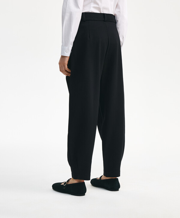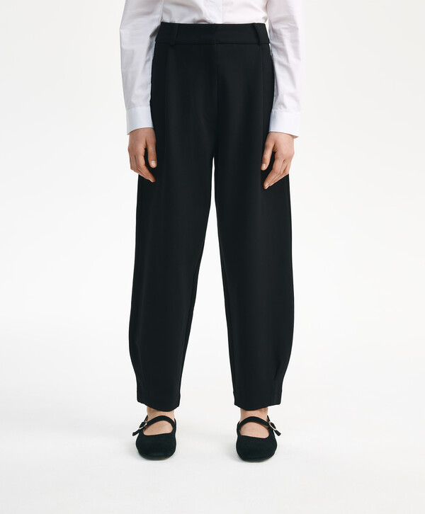Черные трикотажные брюки-слоучи (от англ. slouchy - свободные, мешковатые) — трендовый элемент школьного гардероба! Брюки выполнены из мягкого формоустойчивого джерси на основе вискозы, имеющего гладк... Показать описаниеую матовую поверхность, очень приятную при тактильном контакте. Высокая посадка, характерная форма с сильным заужением к низу, подобная бананам, создают остроту в восприятии вещи. Брюки имеют карманы в боковых швах, необходимые для комфортной эксплуатации. Пояс с внутренней регулировкой объема поможет настроить посадку изделия по фигуре. Брюки застегиваются на молнию, потайной крючок и внутреннюю пуговицу. Шлевки на поясе позволят дополнить брюки поясным аксессуаром. Школьные брюки-слоучи прекрасно сочетаются с классическими и укороченными блузками, с любыми трикотажными и вязаными изделиями, с жилетами и жакетами силуэта оверсайз, с лонгсливами свободного кроя, создавая острые модные школьные образы и не только. 68% вискоза,28% нейлон,4% эластан