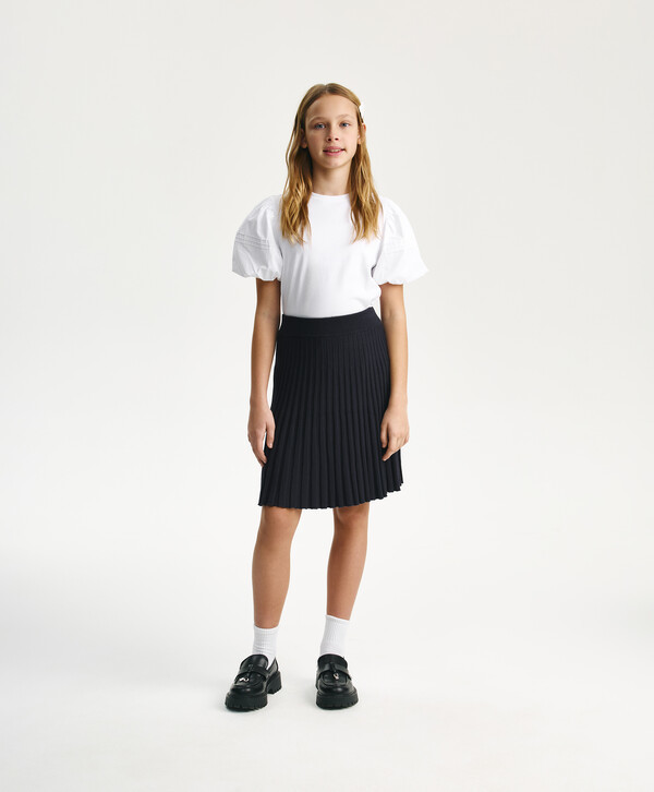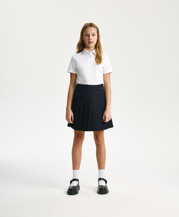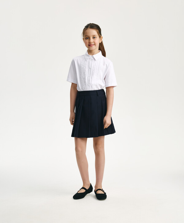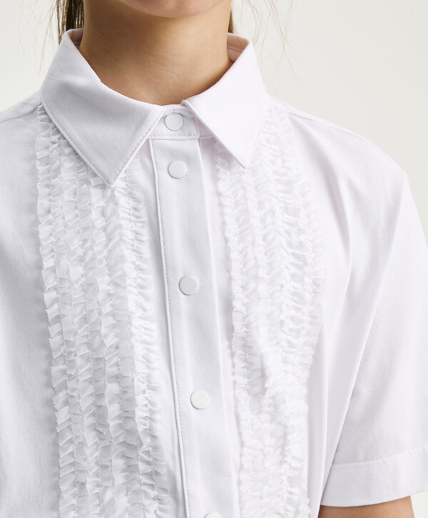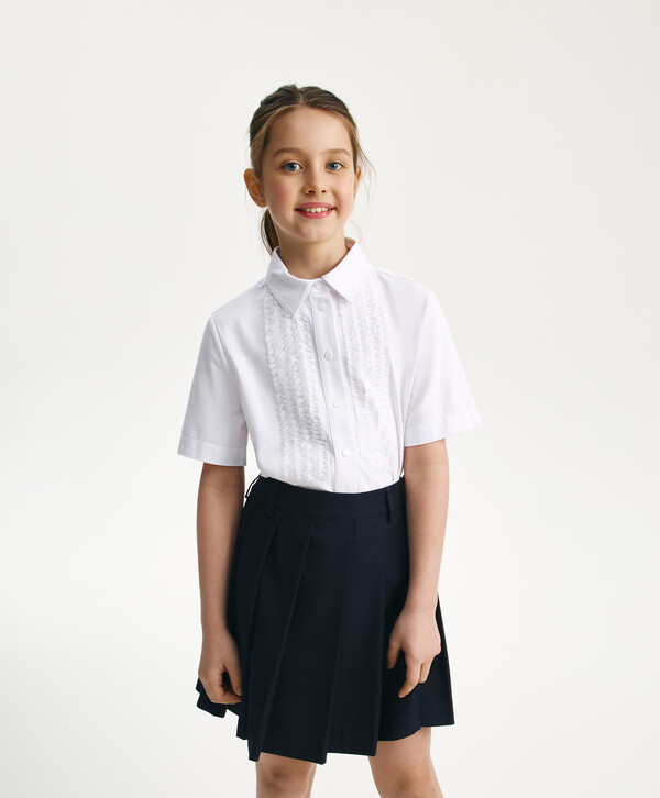 Белая трикотажная блузка с коротким рукавом – необходимая составляющая школьных образов для теплой осени или хорошо отапливаемых классов зимой. Блузка выполнена из мягкого хлопкового полотна с эластан... Показать описаниеом, дарящего ощущение легкости, свежести, комфорта в течение дня. Центральная часть украшена чередой мелких рюшей, придающих стильным комплектам с ней нотку романтики. Блузка гармонично сочетается и с классическими юбками и брюками, и с модными трубами, и с палаццо, легко вписываясь как в строгие, так и в непринужденные образы. Блузка застегивается на кнопки. основная ткань 95% хлопок,5% эластан; отделочная ткань 80% вискоза,20% полиэстер