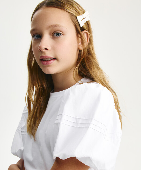 Белая трикотажная блузка прямого кроя с коротким рукавом - отражение актуального минимализма. Изюминка модели - лаконичные рукава-пуфф с мелкими горизонтальными защипами, выполненные из текстиля на т... Показать описаниерикотажной подкладке. Они придают школьной блузке оригинальный вид, привнося в изделие нотки модной этники. Блузка выполнена из мягкого хлопкового полотна с эластаном, очень приятного при тактильном контакте. Лаконичный интеллигентный дизайн делает блузку очень стильной. Она отлично впишется в комплекты и с классическими юбками и брюками, и с дерзкими трубами, и с элегантными палаццо, став основой для модных экспериментов. 95% хлопок,5% эластан