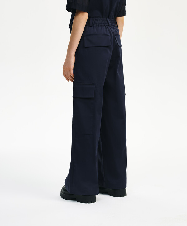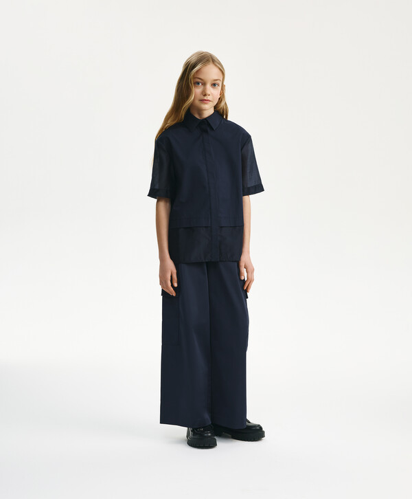Синие широкие брюки с карманами карго - модный, удобный и функциональный выбор для школьного и повседневного гардероба девочки. Брюки выполнены из трехкомпонентного текстиля на основе хлопка, на части... Показать описаниечной шелковистой подкладке. Прямая свободная форма - трубы, созданная благодаря, в том числе, защипам в верхней части, а также крупные карманы-карго с клапанами и ложные клапаны на задних половинках брюк придают им остроту, динамику, непринужденность стритстайла, популярного тренда в среде стильных подростков. Брюки очень комфортны и практичны. Задняя часть пояса сделана на резинке, способствующей удобной эксплуатации изделия. Брюки застегиваются на молнию и пуговицу. Широкие школьные брюки-трубы прекрасно сочетаются с трикотажным пиджаком силуэта оверсайз, водолазкой, блузкой, рубашкой и т.п., создавая острые, стильные и интересные для ребенка комплекты на каждый день. верх 52% хлопок,45% полиэстер,3% эластан; подкладка 53% вискоза,47% полиэстер