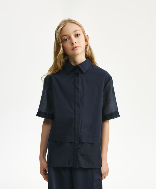 Прямая свободная блузка силуэта оверсайз - стильная интересная вещь, способная разнообразить школьные образы девочки. Изюминка модели - открытые срезы по низу изделия, пройме, кокетке на спинке, манже... Показать описаниетам, карману, воротнику, придающие изделию свободу и непринужденность стритстайла - главного тренда подростковой моды. Несмотря на яркое дизайнерское решение, удлиненная школьная блузка с разрезами в боковых швах выглядит строго и элегантно. Она будет отлично смотреться и с джеггинсами, и с классическими брюками, и с палаццо, став универсальным вариантом для девочки, идущей в ногу со временем. В оформлении блузки использован лаконичный шрифтовой принт. Блузка застегивается на пуговицы, скрытые элегантной супатной планкой. 97% хлопок,3% эластан