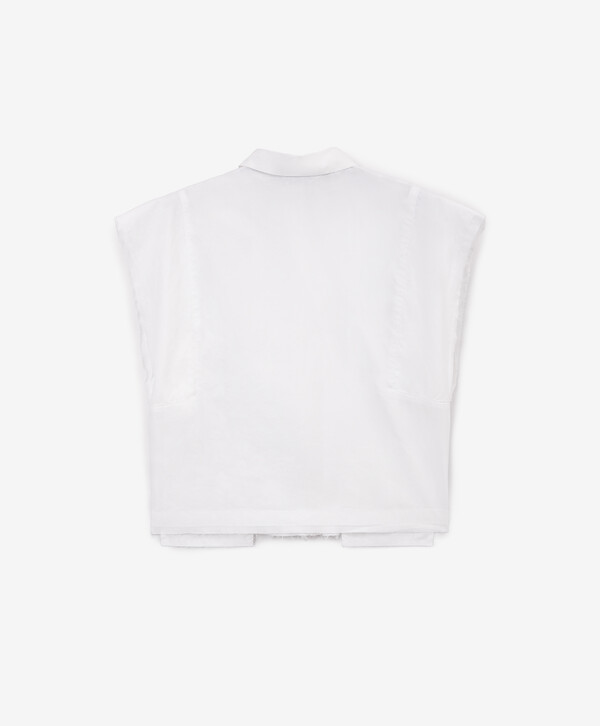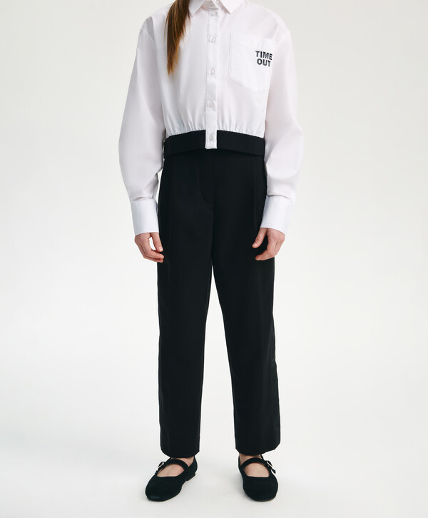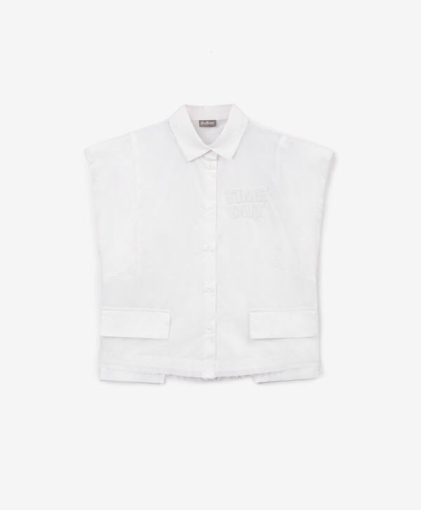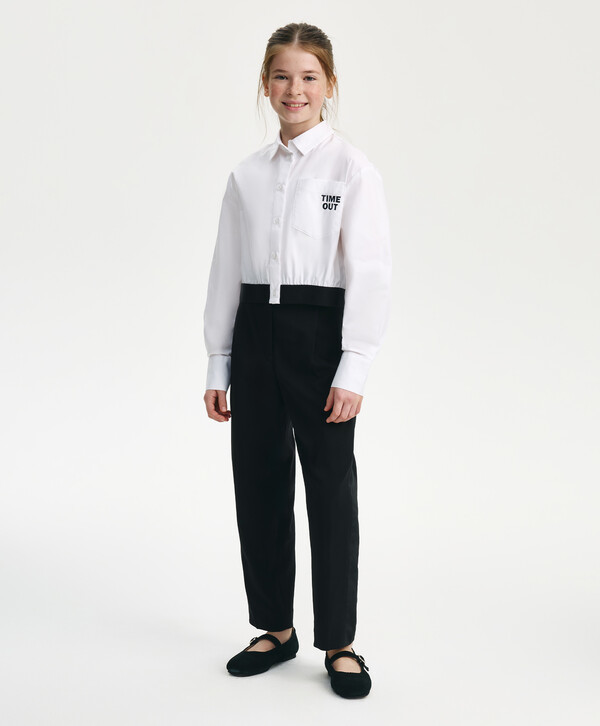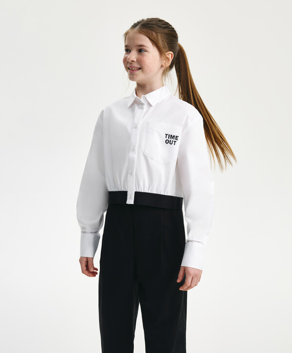 Белая укороченная блузка – острая, модная, интересная вещь, способная подчеркнуть стиль, характер, индивидуальность девочки. Блузка выполнена из формоустойчивого хлопкового поплина. Особенность модели... Показать описание - прорезные карманы с клапанами, выходящие за пределы изделия и имеющие открытые срезы по нижнему краю. Его поддерживают открытые срезы по пройме и низу изделия, транслирующие популярную среди подростков эстетику бунтарского стиля гранж. Заниженная линия плеч с небольшими подплечниками - для усиления формы - создает модные пропорции в образе. Блузка застегивается на пуговицы. В оформлении модели использован лаконичный шрифтовой принт. 100% хлопок
