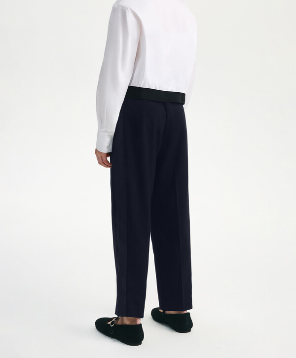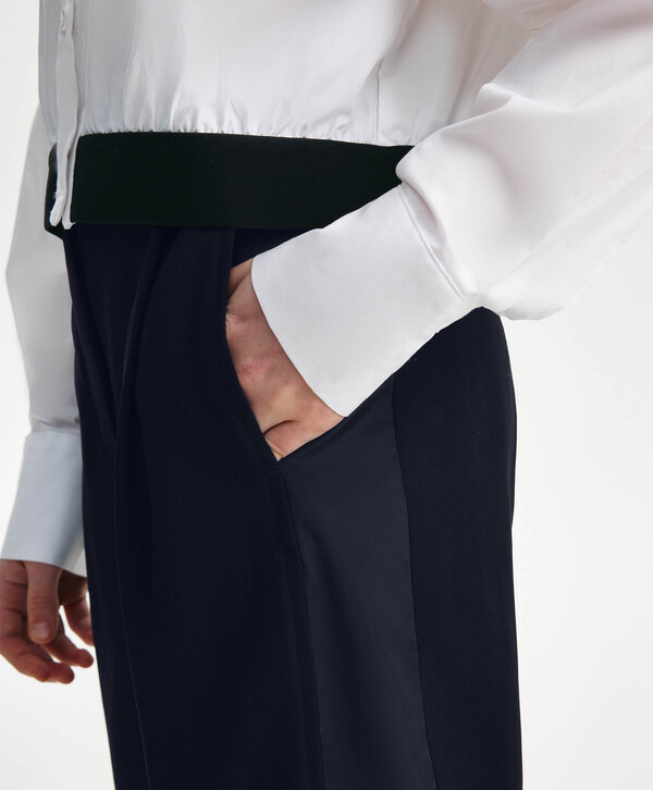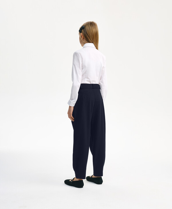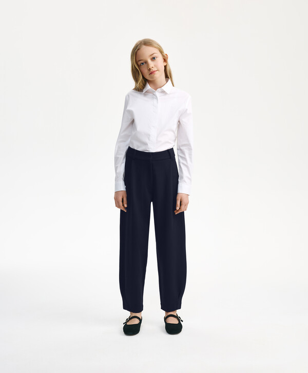 Синие брюки-слоучи (от англ. slouchy - свободные, мешковатые) — трендовый элемент школьного гардероба! Брюки выполнены из мягкой формоустойчивой поливискозы с добавлением натуральной шерсти, имеющей г... Показать описаниеладкую матовую поверхность, очень приятную при тактильном контакте. Высокая посадка, характерная форма с сильным заужением к низу, подобная бананам, создают остроту в восприятии вещи, делают брюки модным современным акцентом образа. О-образная форма брюк создана, в том числе, благодаря крупным складкам в области пояса. Широкие лампасы с открытыми срезами из отделочной ткани добавляют модели индивидуальность. Они наделяют брюки бунтарскими нотками и свободой самовыражения, свойственных стилю гранж. Брюки имеют карманы в швах, необходимые для комфортной эксплуатации. Пояс с внутренней регулировкой объема поможет настроить посадку изделия по фигуре. Брюки застегиваются на молнию, потайной крючок и пуговицу. Шлевки на поясе позволят дополнить школьные брюки любым поясным аксессуаром. Брюки-слоучи прекрасно сочетаются с классическими и укороченными блузками, с любыми трикотажными и вязаными изделиями, с жилетами и жакетами силуэта оверсайз, с лонгсливами свободного кроя, создавая острые модные комплекты в духе времени. верх 67% полиэстер,26% вискоза,5% шерсть,2% эластан; подкладка 53% вискоза,47% полиэстер