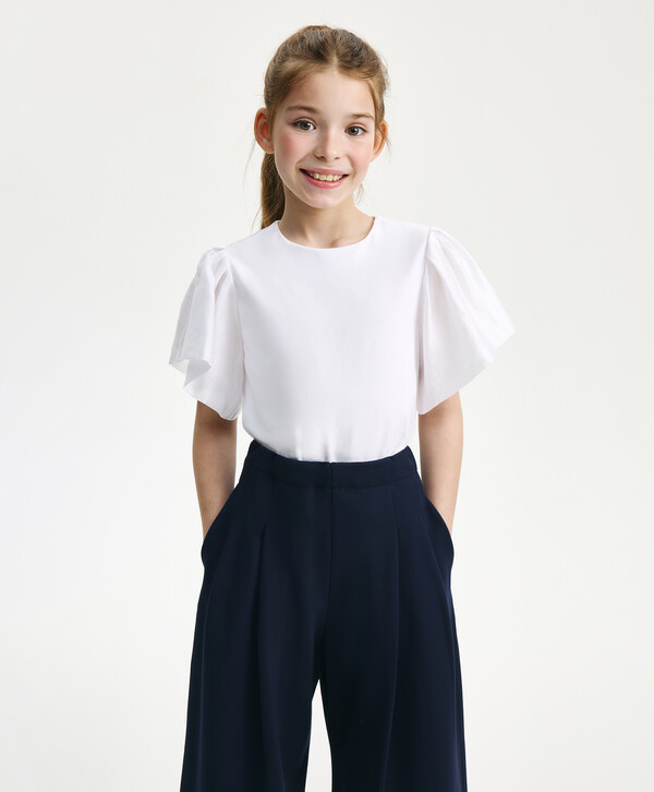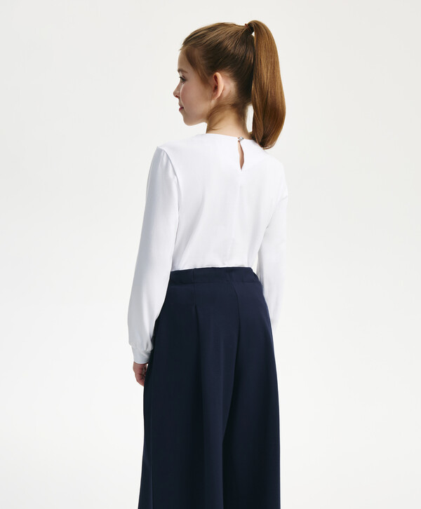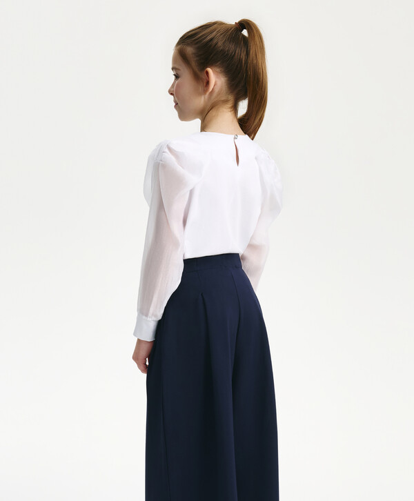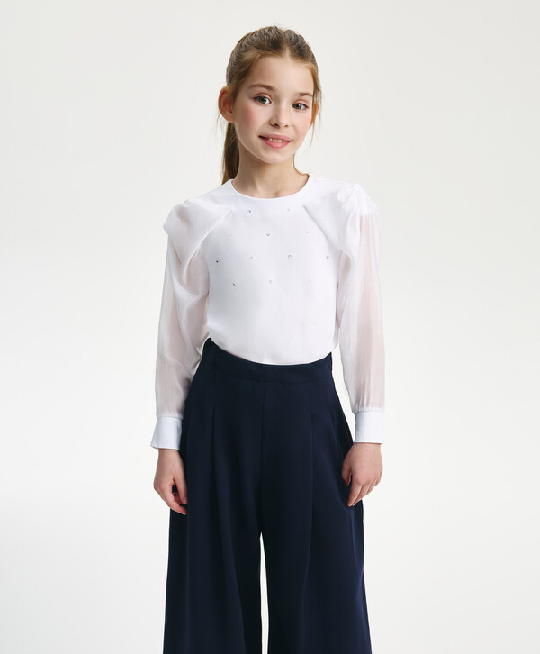 Белая трикотажная блузка выглядит очень изысканно и благородно. Дизайн модели акцентирует внимание на длинных рукавах из полупрозрачного вискозного шифона, собранных в плечевой зоне на лаконичные элег... Показать описаниеантные банты. Манжеты рукавов выполнены из основного материала. Сочетание хлопкового трикотажного полотна с эластаном и легкого воздушного текстиля создает интересную игру фактур, делает блузку выразительной и нарядной. Передняя часть блузки декорирована мелкими сияющими стразами. Блузка имеет застежку-капельку на спинке, фиксирующуюся с помощью навесной петли и пуговицы со стразой. Белая блузка отлично впишется в строгие и в непринужденные образы девочки, гармонично сочетаясь и с классическими юбками и брюками, и с модными трубами, и с элегантными палаццо. основная ткань 95% хлопок,5% эластан; отделочная ткань 80% вискоза,20% полиэстер