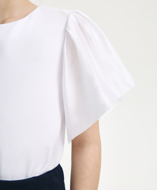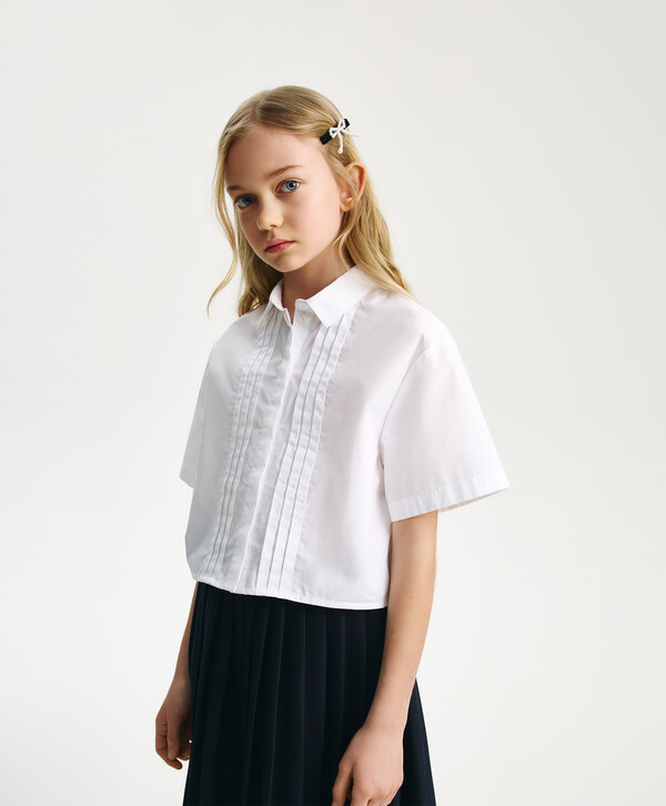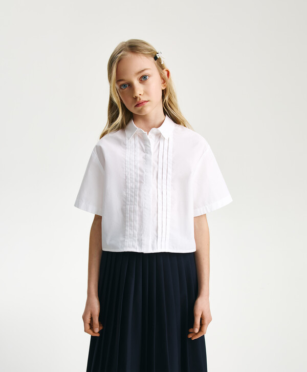 Белая текстильная блузка с коротким рукавом создана для ценительниц изящных акцентов. Укороченная длина, застежка на пуговицы, вертикальные защипы на передней части создают баланс между сдержанной кла... Показать описаниессикой и модным современным дизайном. Легкий и дышащий поплин делает изделие приятным к телу, комфортным в эксплуатации и уходе. Блузка хорошо сочетается с юбками и брюками с высокой посадкой, подчеркивая актуальные пропорции в образе. 100% хлопок