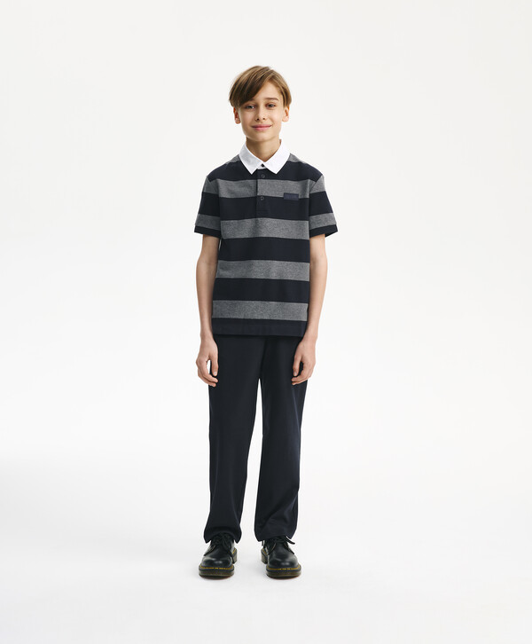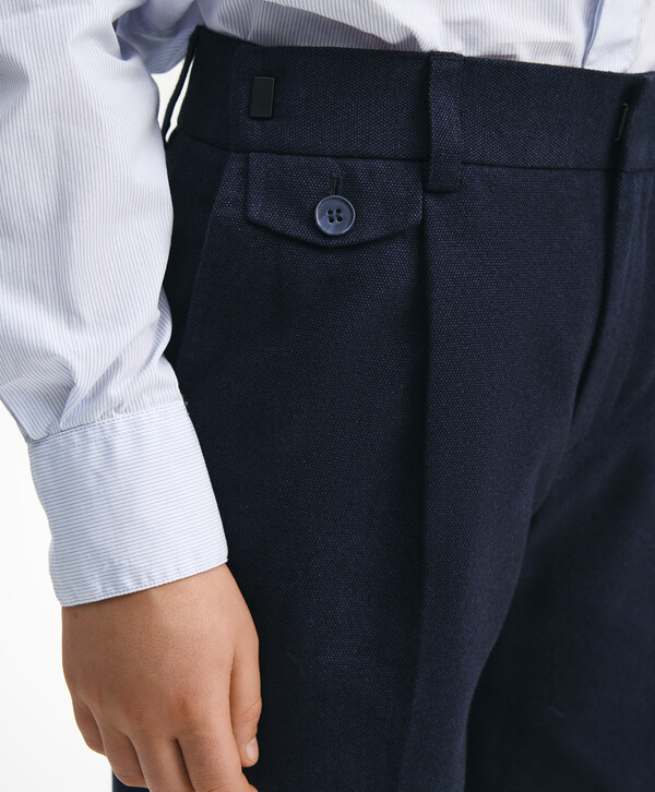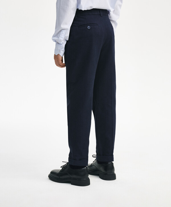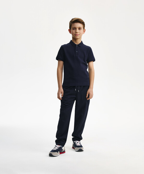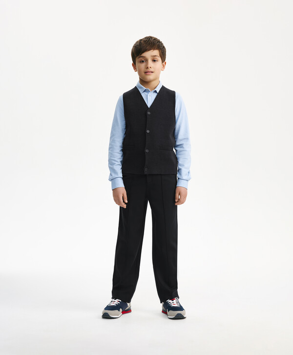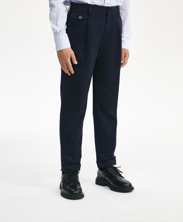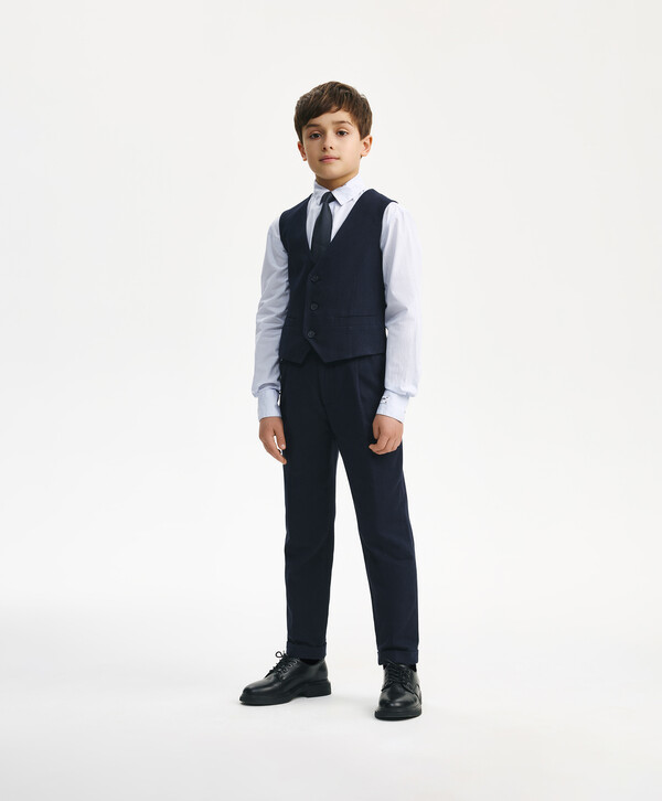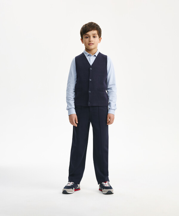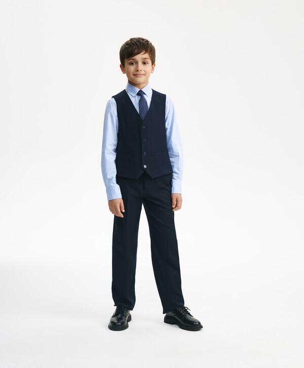 Элегантные классические брюки для школы неотъемлемый атрибут. Прямые синие брюки прекрасно впишутся и в нарядные, и в повседневные образы, подчеркнув строгость, лаконичность, деловые ноты в характере ... Показать описаниемальчика. Брюки выполнены из гладкой меланжевой костюмной ткани с добавлением натуральной шерсти, на шелковистой вискозной подкладке на передней части. Важнейшая деталь модели - умная система регулировки пояса, позволяющая скорректировать его объем для мальчиков разного телосложения. Карманы со скосами, функциональные задние карманы-листочки и традиционная застежка на молнию, пуговицу и крючок создают удобство в эксплуатации вещи. Брюки прекрасно сочетаются с сорочками, водолазками, поло, любыми изделиями из вязаного трикотажа, создавая стильные и интеллигентные школьные образы. Их можно дополнить пиджаком или жилетом из аналогичной ткани, создав костюмы: двойки, тройки. Важно: брюки не подшиты по нижнему краю. Это позволяет самостоятельно, с помощью специальной ленты, прилагающейся к изделию, или иным способом придать брюкам нужную длину в зависимости от роста ребенка. верх 67% полиэстер,27% вискоза,6% шерсть; подкладка 53% вискоза,47% полиэстер