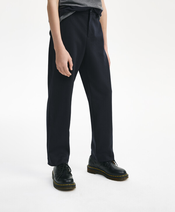 Синие трикотажные брюки прямого кроя – прекрасная альтернатива текстильным брюкам. Они смотрятся строго и стильно, обеспечивая ребенку 100% комфорт. Школьные брюки для мальчика выполнены из трехкомпон... Показать описаниеентного джерси на основе вискозы, отличаются мягкостью, пластичностью, прекрасно держат форму. Застроченные стрелки на передней части придают модели элегантность, а также препятствуют вытягиванию изделия в коленной зоне. Пояс на резинке обеспечивает комфортную посадку на фигуру любого типа. Брюки имеют удобные карманы с наклоном. Застегиваются на молнию и пуговицу. 68% вискоза,28% нейлон,4% эластан