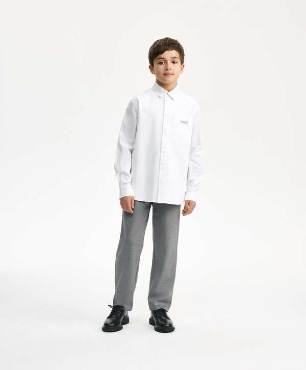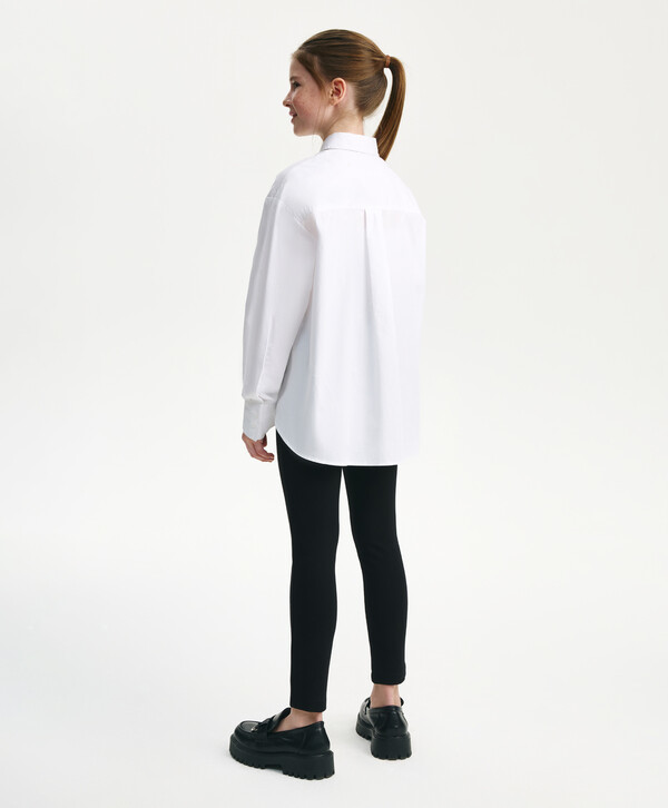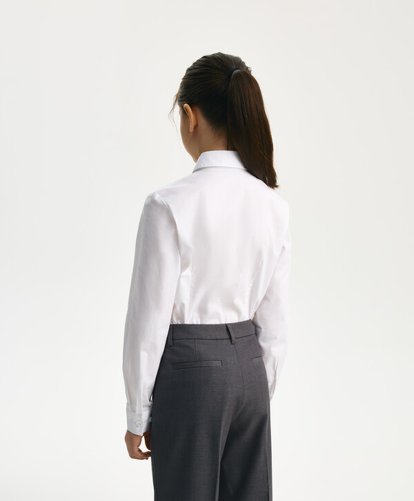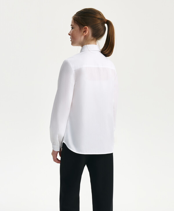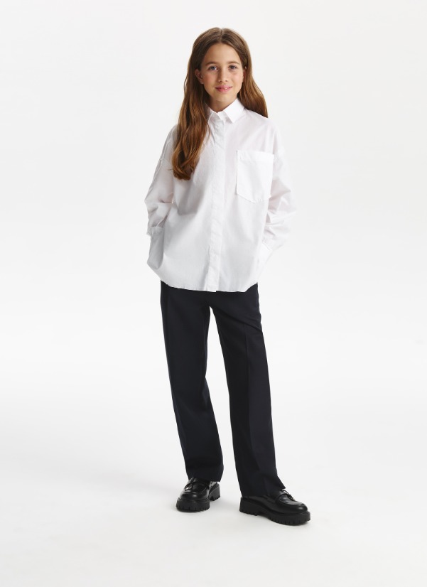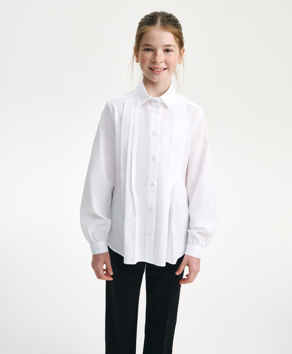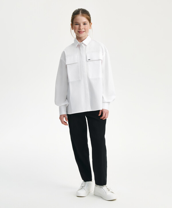 Белая школьная блузка с длинным рукавом – прекрасный выбор для создания модных, современных, элегантных образов девочки. Удлиненная блузка силуэта умеренный оверсайз с заниженной линией спинки выполне... Показать описаниена из легкого хлопкового текстиля, комфортного в эксплуатации и уходе. Форма модели обеспечивает свободу движений, создает современные пропорции в образе. Крупный накладной карман подчеркивает минималистичность дизайна, делая блузку образцом стильной вещи для школы и свободного времени. Белая блузка прекрасно сочетается с классическими брюками, текстильными и трикотажными брюками-палаццо, джеггинсами, кюлотами и другими предметами подросткового гардероба. 100% хлопок
