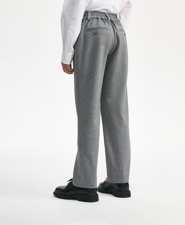 Серые трикотажные брюки – прекрасная альтернатива строгой классике! Брюки прямой формы выполнены из меланжевого трикотажного полотна, по внешнему виду и тактильным ощущениям максимально приближенного ... Показать описаниек текстилю. Они прекрасно держат форму и благодаря резинке на задней части пояса, очень комфортны в эксплуатации. Внутренняя часть брюк частично усилена шелковистой подкладкой. Брюки застегиваются на молнию и пуговицу, имеют удобные карманы со скосом, а также функциональные карманы-листочки на задних половинках. Серые школьные брюки легко комбинируются с рубашками и сорочками любого кроя, лонгсливами, джемперами, любыми изделиями из вязаного трикотажа и могут быть дополнены пиджаками и жилетам для создания образов, уместных на торжественных или официальных мероприятиях. верх 74% полиэстер,23% вискоза,3% эластан; подкладка 53% вискоза,47% полиэстер