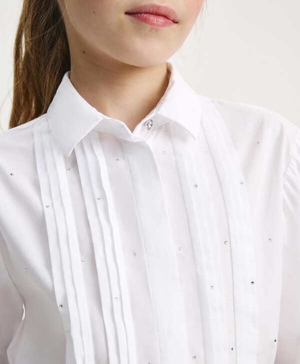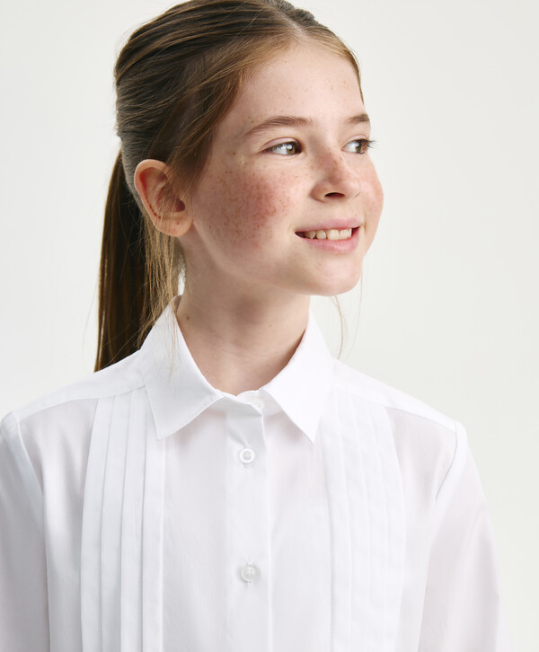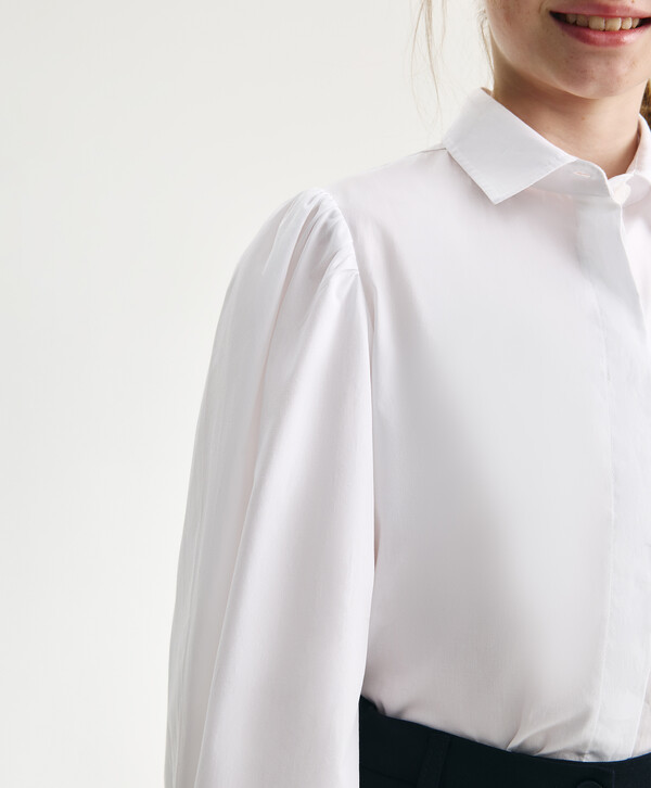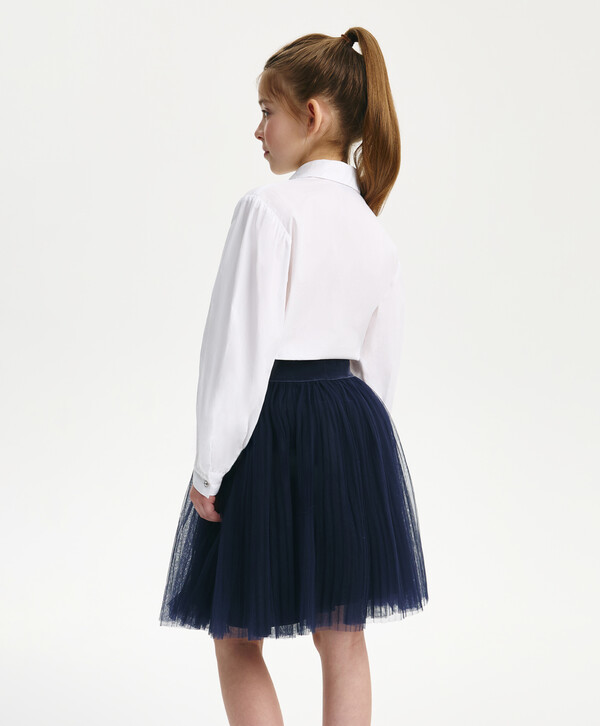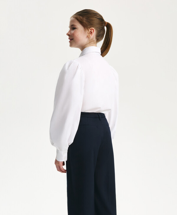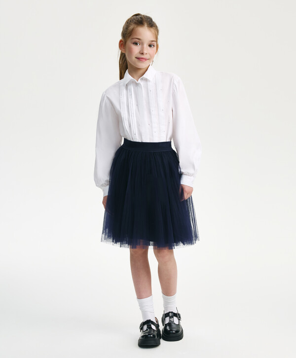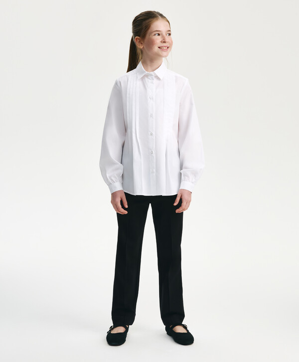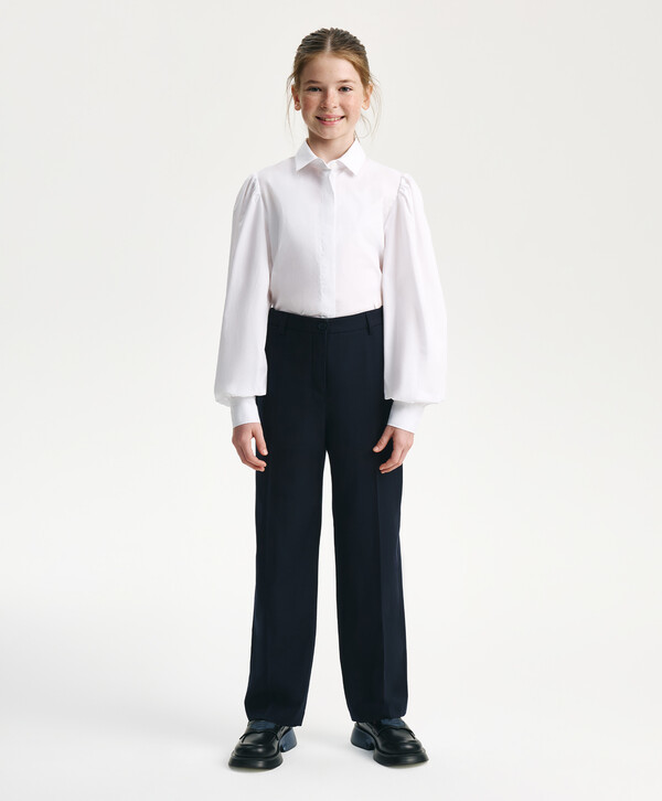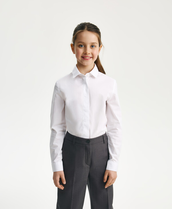 Белая блузка с длинным рукавом – важная составляющая стильных школьных образов девочки. Блузка выполнена из легкого хлопкового текстиля, комфортного в эксплуатации и уходе. Классический прямой крой и&... Показать описаниеnbsp; супатная застежка на пуговицы придают модели строгий и лаконичный вид. Объемные присборенные рукава блузки служат ее главным акцентом, позволяя интегрировать ее как в повседневные школьные комплекты, так и в образы для любых торжественных мероприятий. 100% хлопок
