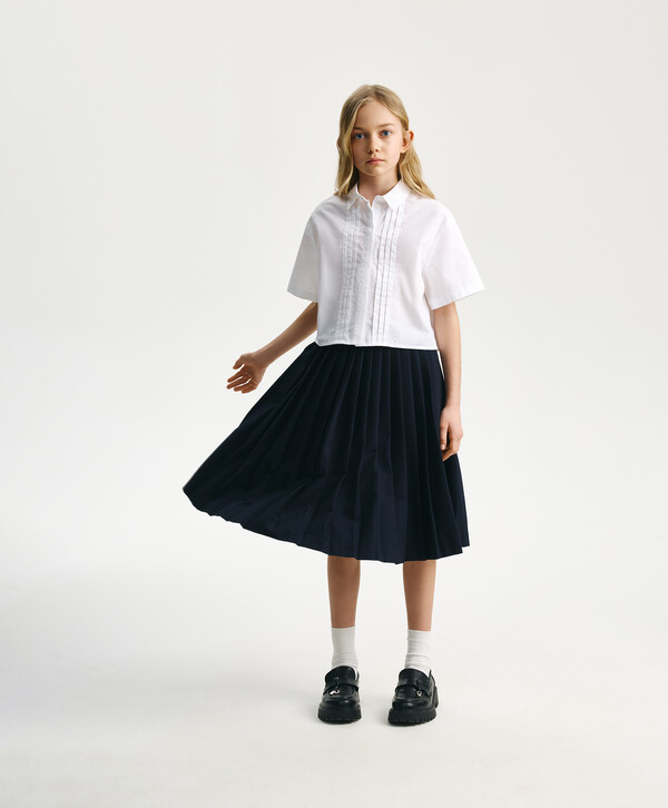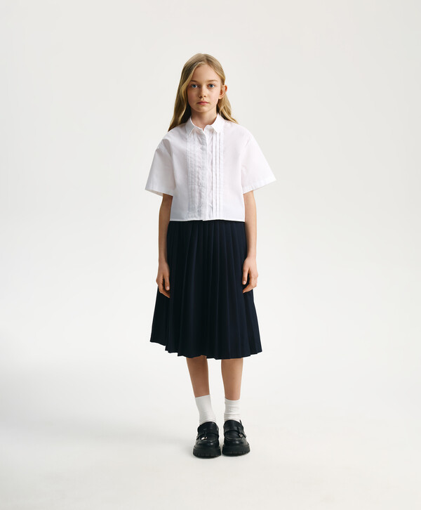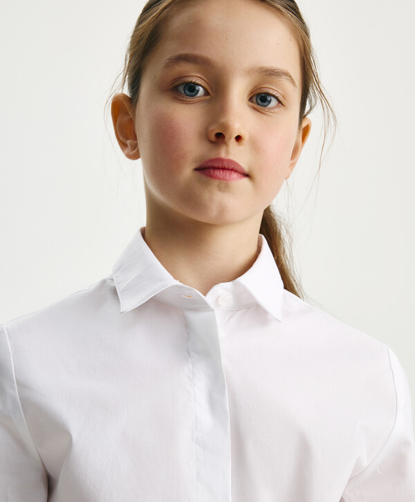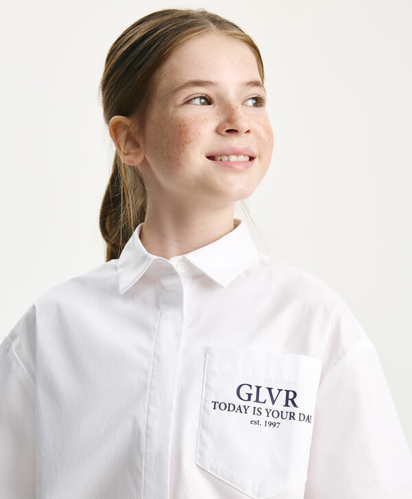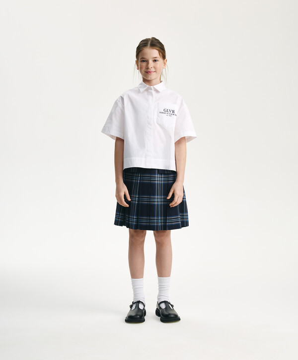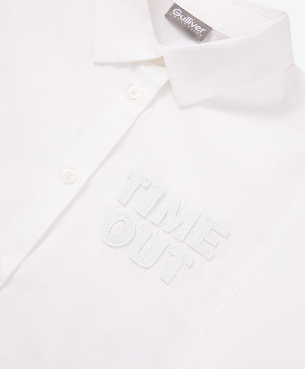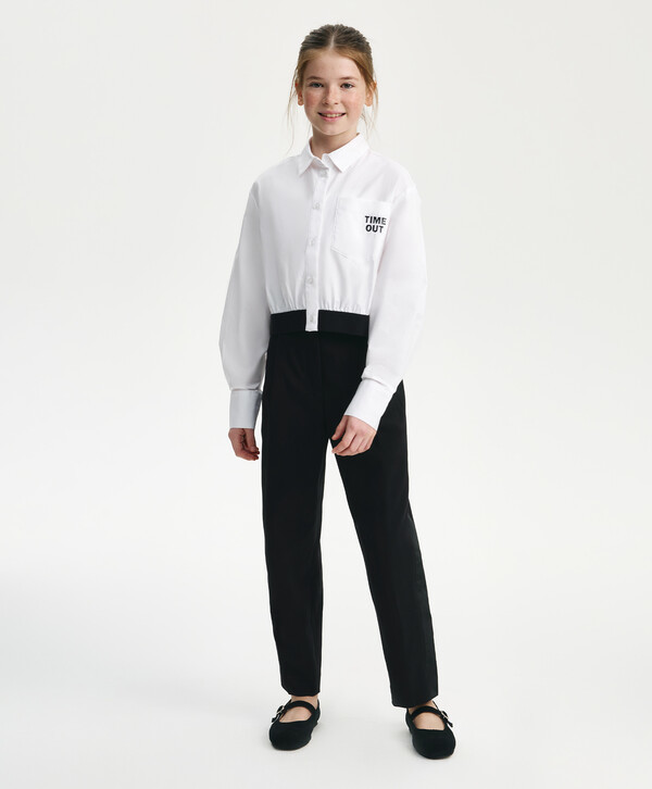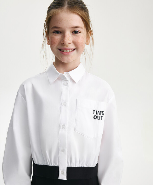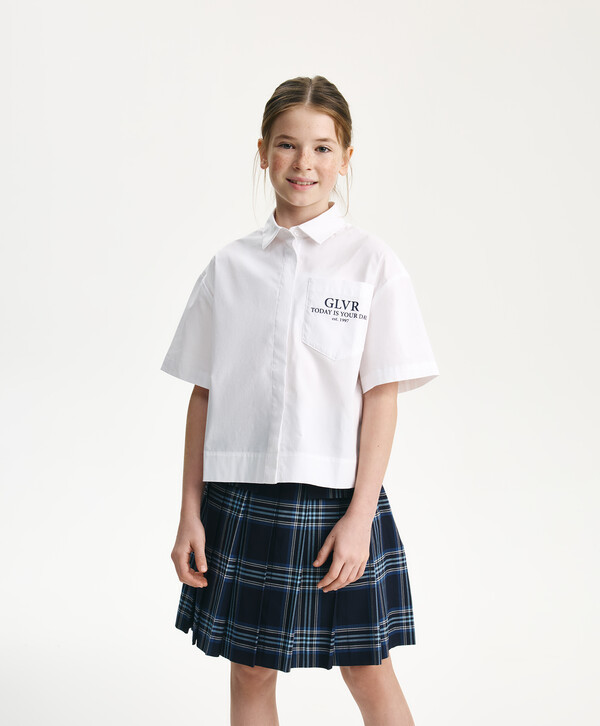 Рубашки школьные с коротким рукавом - неотъемлемая составляющая повседневного гардероба девочки. И как единичные изделия ранней осенью, когда на улице еще тепло, и как часть многослойных образов зимой... Показать описание, они являются базой для создания стильных школьных комплектов. Рубашка укороченная белая выполнена из легкого хлопкового текстиля, очень приятного при тактильном контакте. Модный крой, лаконичный дизайн делают ее образцом рубашки с коротким рукавом для девочек, предпочитающих стильные минималистичные решения. Рубашка оверсайз имеет небольшие разрезы в боковых швах. Неброский шрифтовой принт на накладном кармане придает модели уникальность. Рубашка застегивается на пуговицы, скрытые элегантной супатной планкой. 97% хлопок,3% эластан
