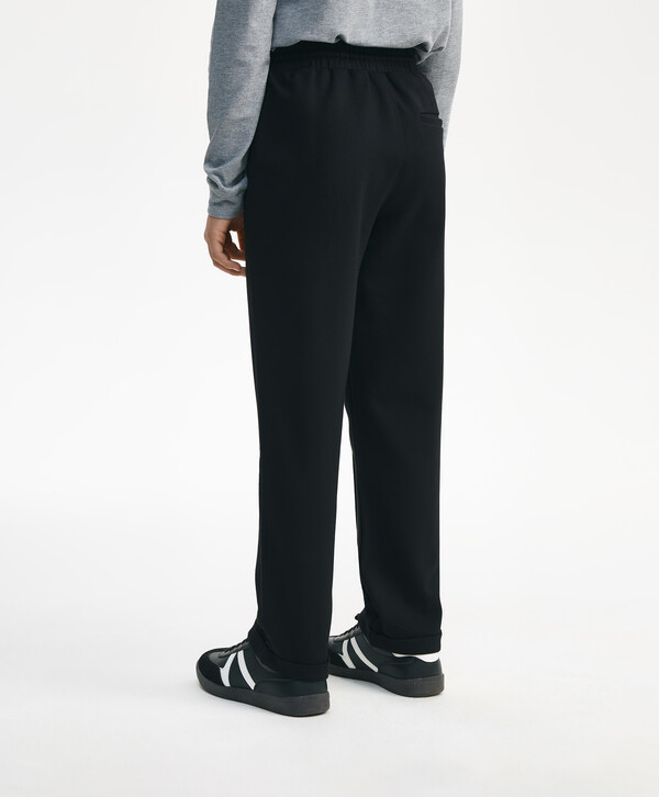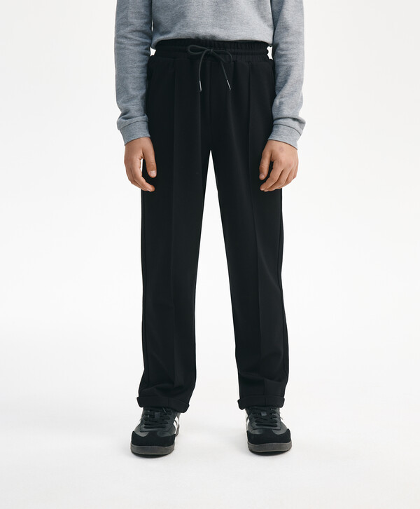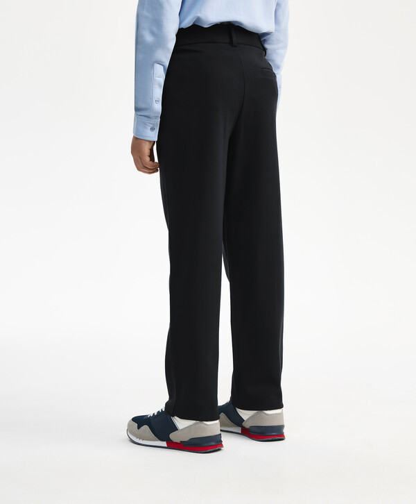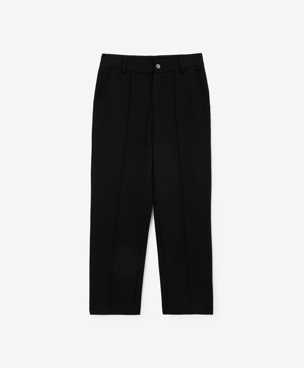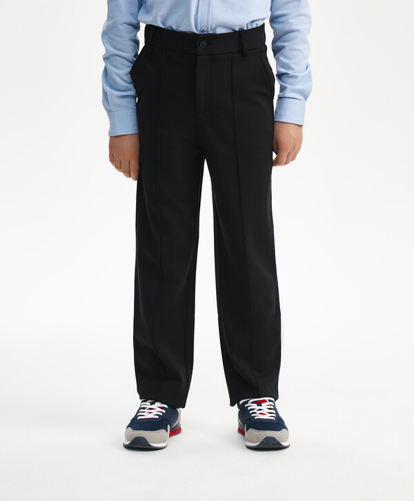 Черные трикотажные брюки прямого кроя – прекрасная альтернатива текстильным брюкам. Они смотрятся строго и стильно, обеспечивая ребенку 100% комфорт. Школьные брюки для мальчика выполнены из трехкомпо... Показать описаниенентного джерси на основе вискозы, отличаются мягкостью, пластичностью, прекрасно держат форму. Застроченные стрелки на передней части придают модели элегантность, а также препятствуют вытягиванию изделия в коленной зоне. Пояс на резинке обеспечивает комфортную посадку на фигуру любого типа. Брюки имеют удобные карманы с наклоном. Застегиваются на молнию и пуговицу. 68% вискоза,28% нейлон,4% эластан