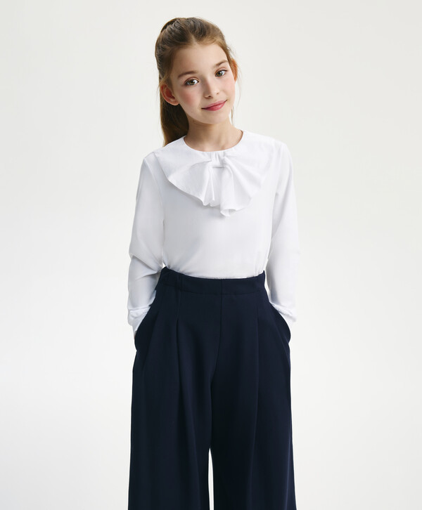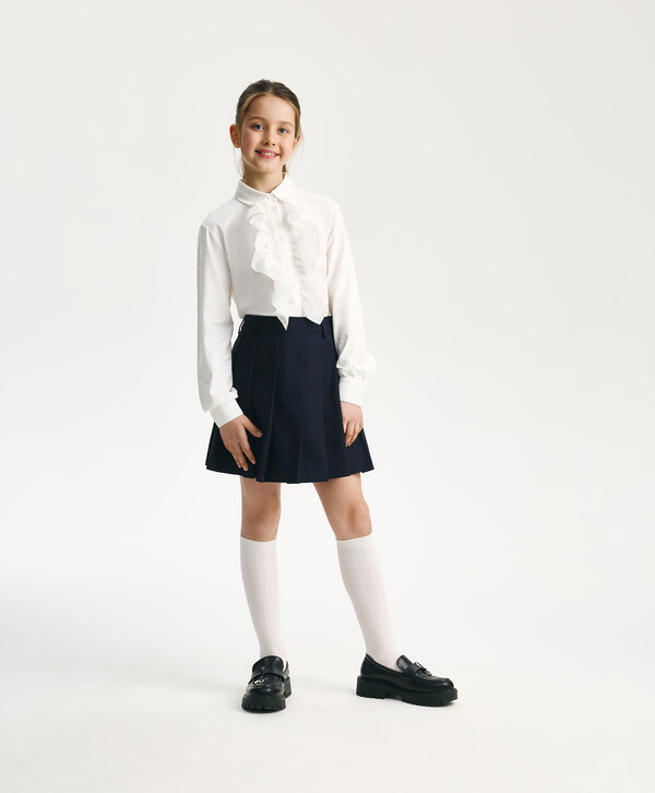 Блузка с длинным рукавом молочного цвета – элегантный акцент школьного гардероба. Блузка прямой свободной формы выполнена из мягкого хлопкового трикотажного полотна с эластаном, дарящего ощущение легк... Показать описаниеости, свежести, комфорта в течение дня. Центральная часть украшена чередой мелких текстильных рюшей, придающих школьным комплектам с ней нотку романтики. Молочная блузка для школы гармонично сочетается и с классическими юбками и брюками, и с модными трубами, и с палаццо, легко вписываясь как в строгие, так и в более непринужденные образы. Блузка застегивается на кнопки. основная ткань 95% хлопок,5% эластан; отделочная ткань 80% вискоза,20% полиэстер