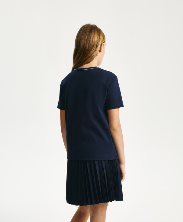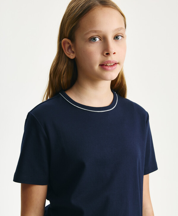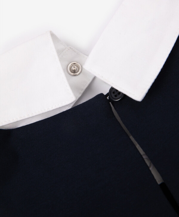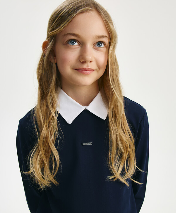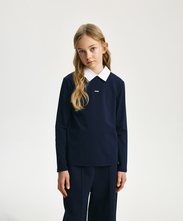 Синяя трикотажная блузка с длинным рукавом — изящный акцент школьного гардероба девочки. Блузка прямой формы выполнена из мягкого хлопкового трикотажного полотна, дарящего ощущение легкости, свежести,... Показать описание комфорта в течение дня. Контрастный белый воротник придаёт образу утонченность и элегантность. Текстильный воротник пристегивается к блузке на кнопки, что позволяет носить ее и с воротником, и без, и всегда выглядеть свежо и аккуратно. Блузка имеет застежку-капельку на спинке, фиксирующуюся на пуговицу с навесной петлей. В оформлении модели использована небольшая металлическая брендированная табличка. Школьная блузка гармонично сочетается и с классическими юбками и брюками, и с модными трубами, и с палаццо, легко вписываясь как в строгие, так и в непринужденные образы. основная ткань 95% хлопок,5% эластан; отделочная ткань 100% хлопок