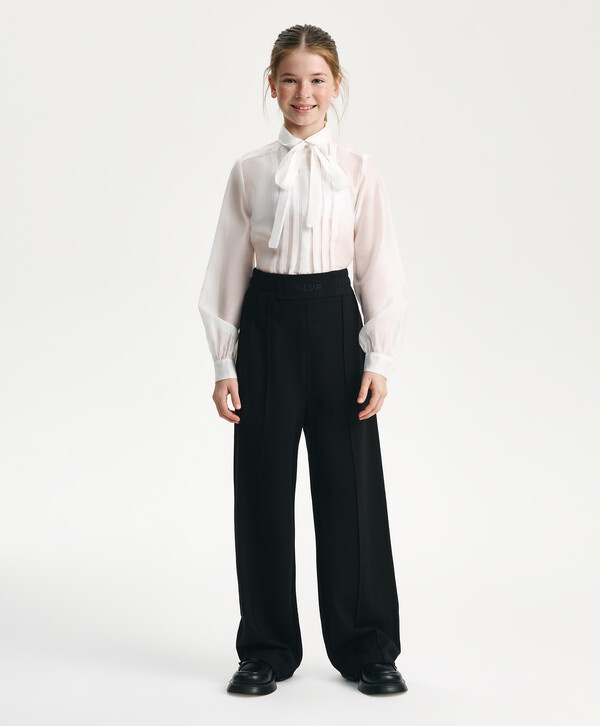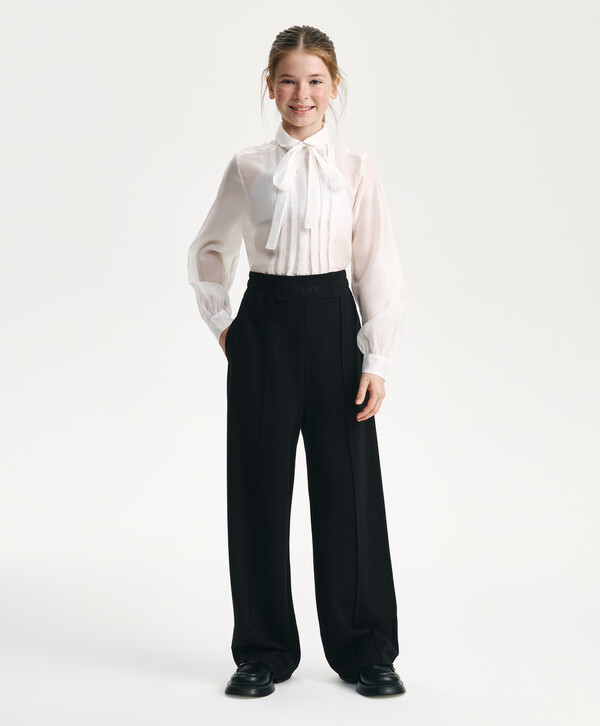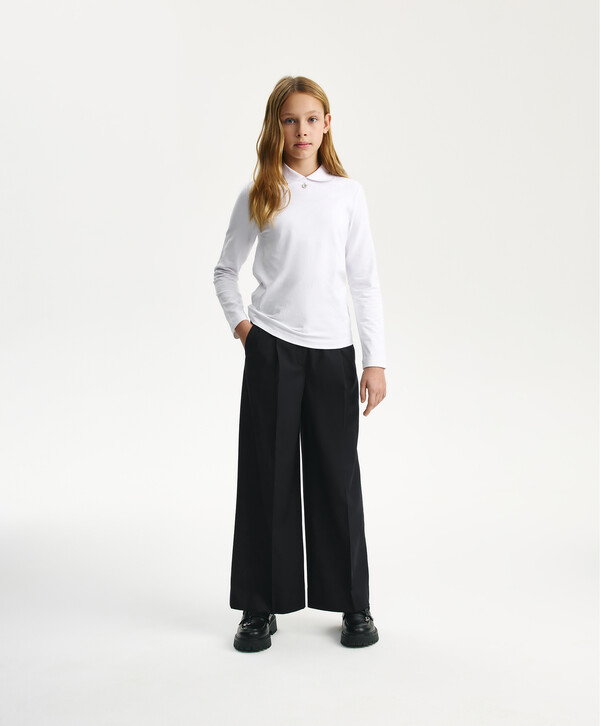 Широкие черные брюки из костюмной ткани – модный выбор, делающий подростка иконой стиля! Прямая свободная форма, защипы на передней части придают модели острый современный вид. Школьные брюки на шелко... Показать описаниевистой подкладке выполнены из поливискозы, отличающейся прочностью, мягкостью, долговечностью и эстетичным внешним видом. Удобные карманы со скосом на передней части и карманы-листочки сзади обеспечивают комфортную эксплуатацию вещи. Брюки застегиваются на молнию, брючный крючок и пуговицу. Они станут прекрасной парой с рубашкой прямого кроя, пиджаком оверсайз, любым изделием из вязаного трикотажа, объемным свитшотом и толстовкой из мягкого футера, создав стильный и выразительный образ в духе времени. верх 68% полиэстер,29% вискоза,3% эластан; подкладка 53% вискоза,47% полиэстер