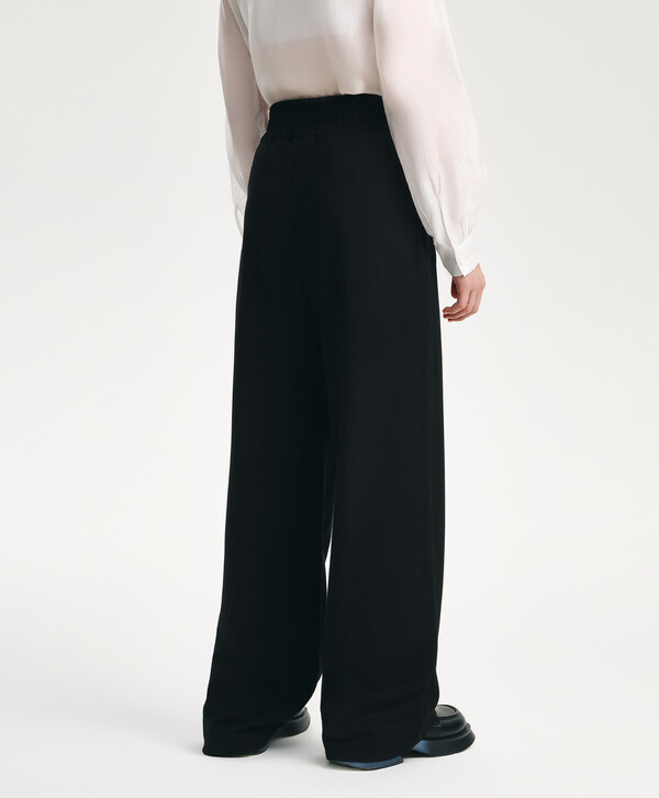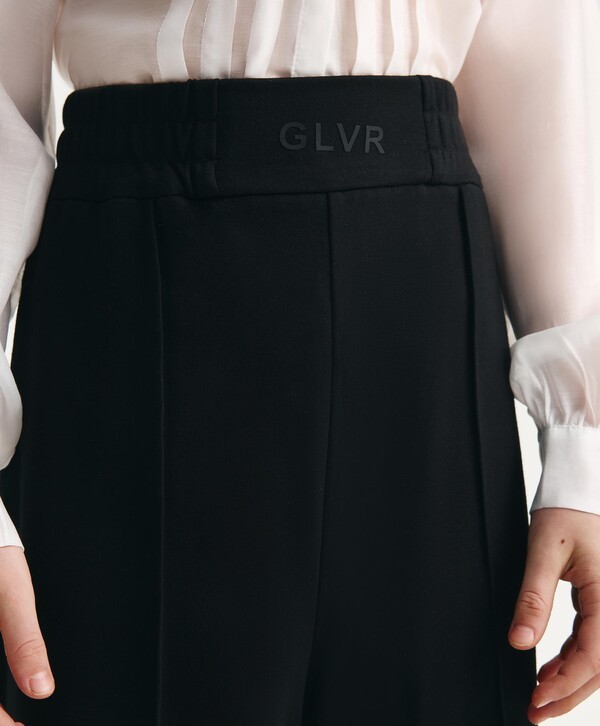 Черные трикотажные брюки палаццо с поясом на резинке —модное и красивое решение и для школьного гардероба, и для свободного времени. Это тот самый универсальный низ, который с любым плечевым изделием ... Показать описаниевыглядит нарядно, элегантно, изысканно. Брюки выполнены из мягкого шелковистого джерси на основе вискозы, прекрасно держащего форму и очень комфортного в эксплуатации. Высокая посадка и струящаяся пластика трикотажного полотна придают образу аристократичность. Застроченные стрелки на передней части подчеркивают строгие деловые ноты в имидже девочки, а также препятствуют вытягиванию изделия в коленной зоне. Школьные брюки имеют карманы в боковых швах. В оформлении модели использован неброский шрифтовой принт. 68% вискоза,28% нейлон,4% эластан