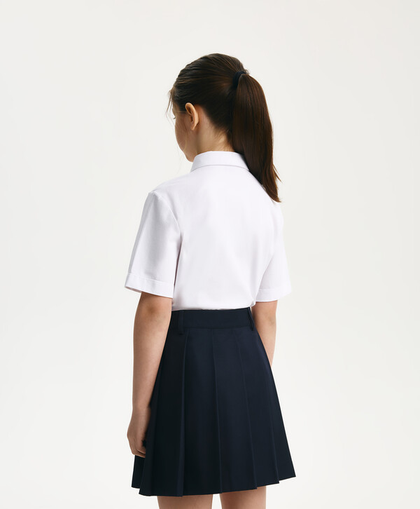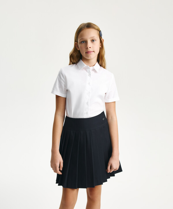Белая блузка с коротким рукавом – прекрасная базовая вещь для школьных образов девочки. Блузка выполнена из легкого хлопкового текстиля с эластаном, очень комфортного в эксплуатации и уходе. Минимали... Показать описаниестичный дизайн, прямой крой и застежка на пуговицы придают модели строгий лаконичный вид, делают ее универсальным вариантом для школьного гардероба и не только. 97% хлопок,3% эластан