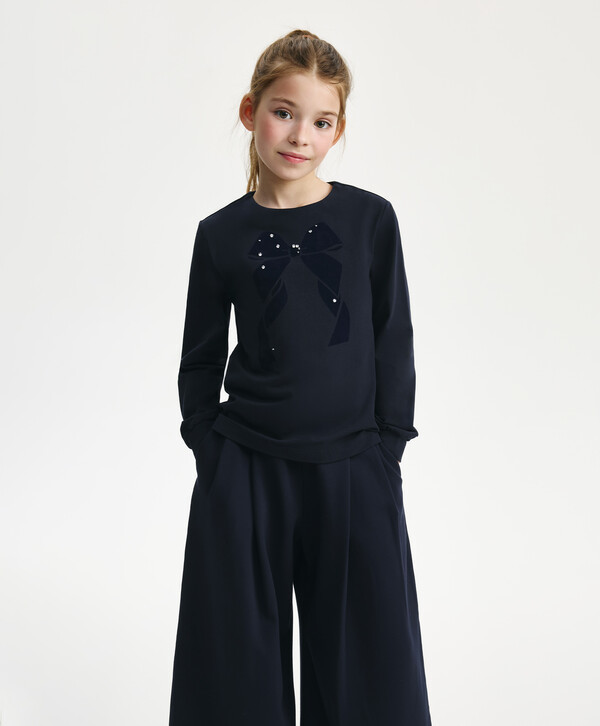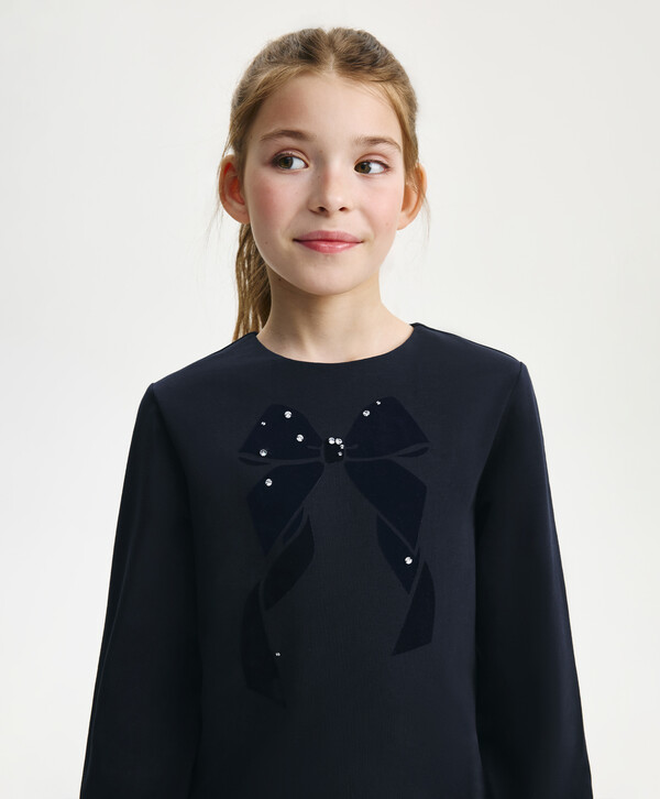 Синяя блузка с длинным рукавом — прекрасный выбор для повседневного школьного гардероба девочки. Блузка с заниженной линией спинки и небольшими разрезами в боковых швах выполнена из трикотажного хлоп... Показать описаниекового полотна с эластаном, очень комфортного в эксплуатации и уходе. Передняя часть изделия украшена принтованным флоковым декором - бантом, оформленным мелкими стразами. Школьная блузка имеет застежку-капельку на спинке, фиксирующуюся с помощью навесной петли и пуговицы с крупной стразой. 95% хлопок,5% эластан