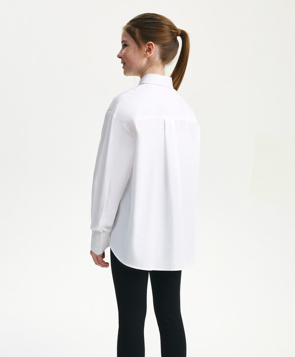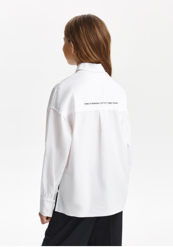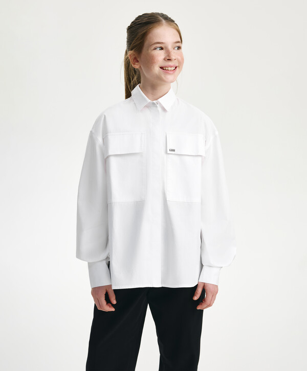 Белая удлиненная блузка с длинным рукавом силуэта умеренный оверсайз – прекрасная возможность сделать школьный гардероб девочки свежим, стильным, комфортным! Блузка выполнена из легкого, тактильно при... Показать описаниеятного хлопкового текстиля. Два объемных кармана с клапанами на передней части, заниженная линия спинки с высокими разрезами в боковых швах, а также лаконичный шрифтовой принт на спинке придают модели острый современный вид. Блузка застегивается на кнопки, скрытые супатной планкой. 97% хлопок,3% эластан