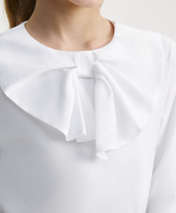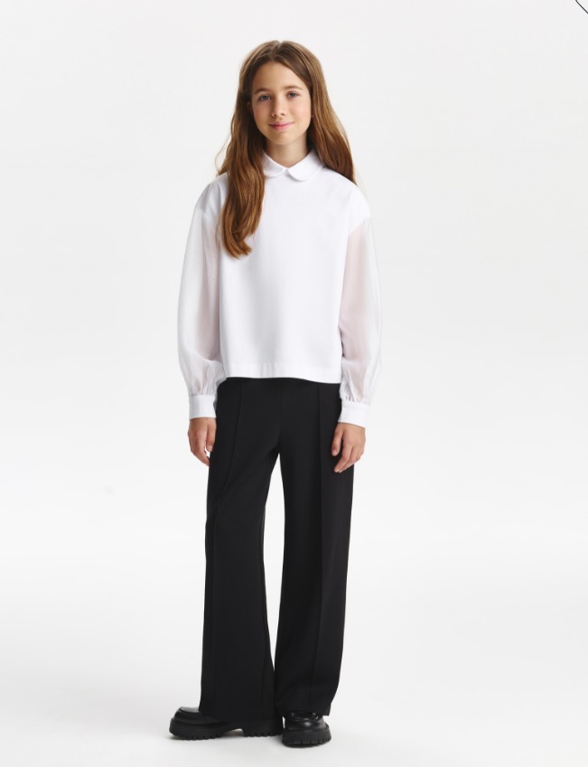 Белая школьная блузка с длинным рукавом – важный атрибут гардероба девочки. Дизайн модели построен на сочетании фактур трикотажного полотна с эластаном, из которого выполнена основа блузки, и полупро... Показать описаниезрачного вискозного шифона на рукавах. Прямой свободный крой, заниженная линия плеч и небольшой скругленный воротник из основного материала делают блузку воплощением гармоничного сочетания традиций и трендов. Она прекрасно впишется в образы с любыми текстильными и трикотажными брюками, юбками, сарафанами, создав строгий, скромный, элегантный образ ученицы. Блузка застегивается на потайную молнию на спинке. 95% хлопок,5% эластан