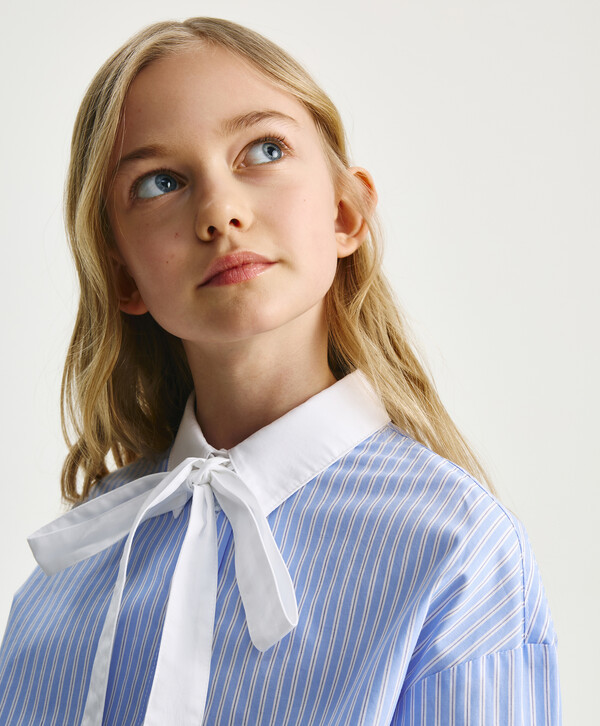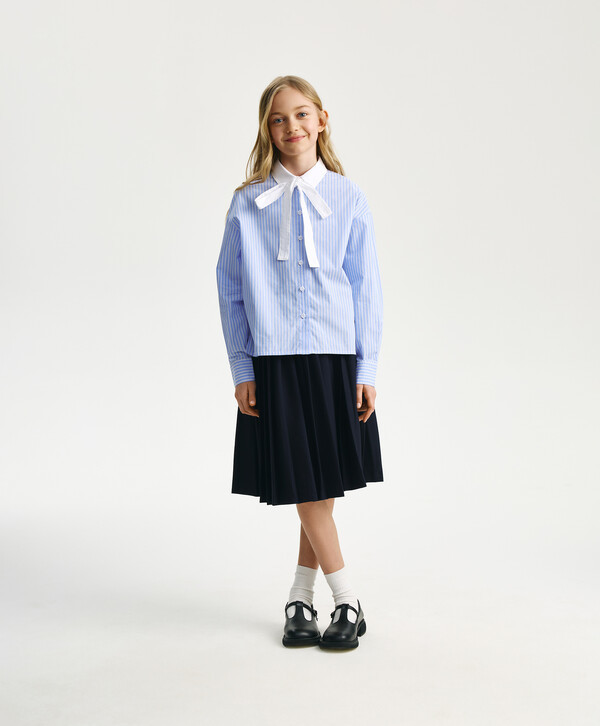 Голубая блузка в полоску с длинным рукавом—прекрасная возможность разнообразить школьные образы. 100% хлопковый текстиль делает блузку приятной к телу, простой в эксплуатации и уходе. Белый воротник с... Показать описание акцентным бантом-галстуком, который проходит через шлевку на стойке, а также вертикальные защипы на полочке придают образу ученицы нарядный вид. И с бантом, и без него, голубая блузка выглядит очень деликатно и интеллигентно. Она отлично сочетается с сарафанами, юбками и брюками, легко адаптируясь к любым школьным комплектам. Блузка застегивается на пуговицы. основная ткань 100% хлопок; отделочная ткань 100% хлопок