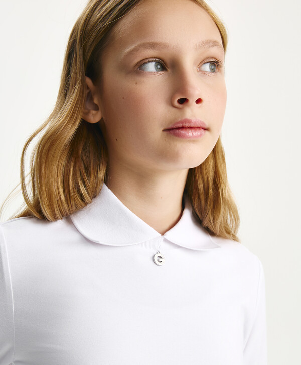 Белая блузка с длинным рукавом создана для лаконичных и изящных школьных образов. Как и большинство трикотажных изделий, белая блузка очень комфортна, пластична, приятна тактильно. Отложной воротник, ... Показать описаниевыполненный из мягкого риба, добавляет блузке шарм, изысканность, деликатность. В оформлении модели использован небольшой репсовый бантик с навесной металлической буквой, оформленной мелкими стразами. 95% хлопок,5% эластан