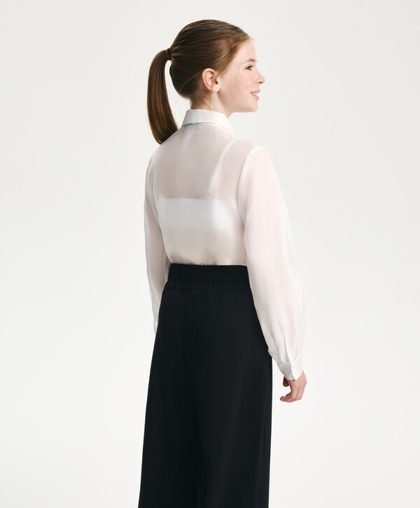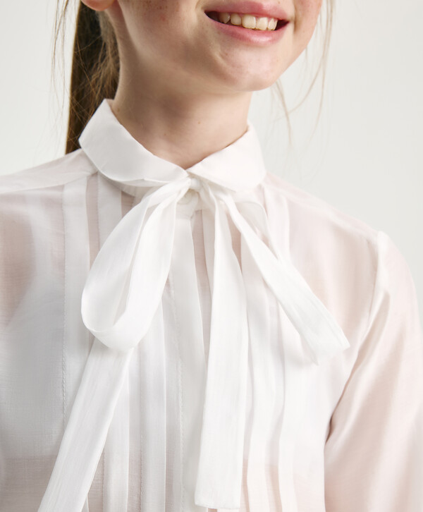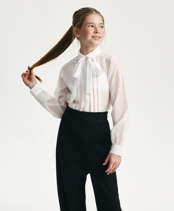 Блузка молочного цвета с длинным рукавом из полупрозрачного шифона —прекрасная возможность придать школьному образу нежность и воздушность. Несмотря на кажущуюся легкость, шифон на основе вискозы - не... Показать описание только очень мягкий и приятный на ощупь материал, но и прочный. Школьную блузку с длинным рукавом украшают вертикальные защипы и съемный галстук-бант, проходящий через шлевку на стойке. И с бантом, и без него, молочная блузка выглядит очень деликатно и интеллигентно. Она отлично сочетается с сарафанами, юбками и брюками, легко адаптируясь как к повседневным, так и к нарядным школьным комплектам. Блузка застегивается на пуговицы, скрытые элегантной супатной планкой. 80% вискоза,20% полиэстер