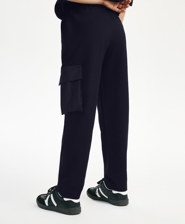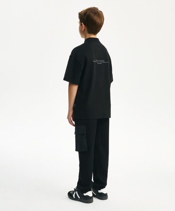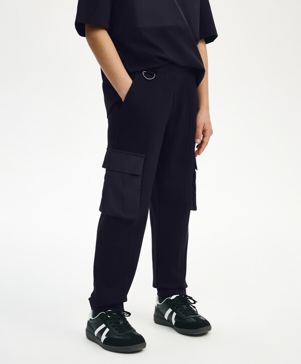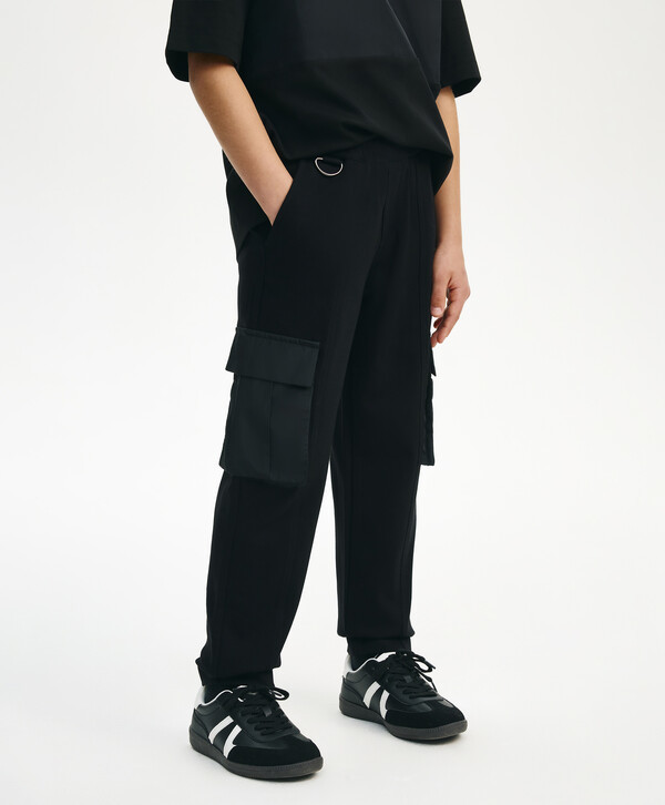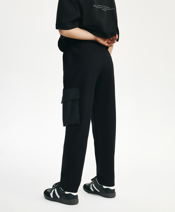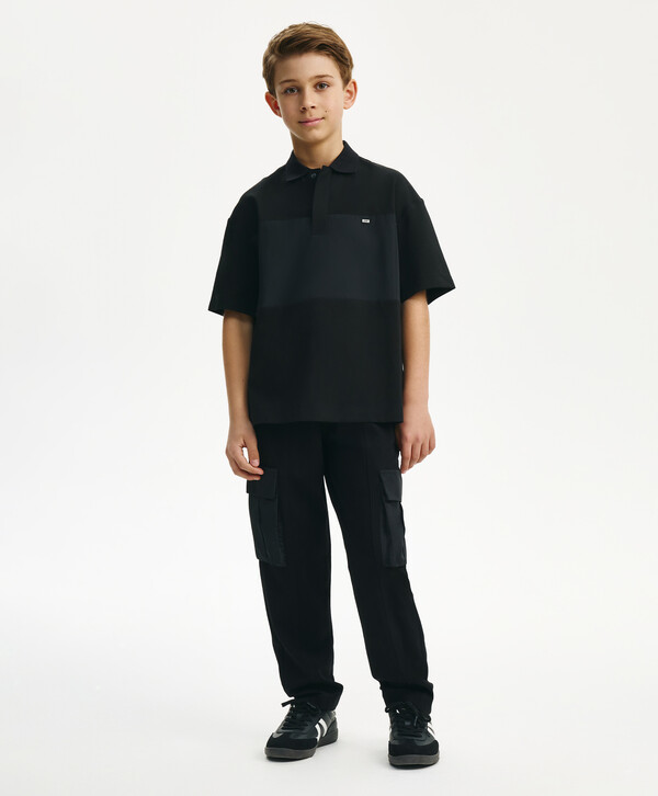 Черные трикотажные для мальчика с поясом на резинке – прекрасное решение и для школьных будней, и для свободного времени. Брюки выполнены из комфортного, пластичного и формоустойчивого джерси на основ... Показать описаниее вискозы. Брюки функциональны и практичны. Два боковых кармана со скосом на передней части делают эксплуатацию изделия удобной. Два накладных кармана-карго, выполненные из влагостойкой плащовки, добавляют модели динамику спортивного стиля. Застроченные стрелки на передней части придают брюкам красивое завершение, а также препятствуют вытягиванию изделия в коленной зоне. Школьные трикотажные брюки гармонично сочетаются с лонгсливами, худи, свитшотами, распашными толстовками, позволяя создавать модные, удобные, энергичные комплекты в духе времени. 68% вискоза,28% нейлон,4% эластан