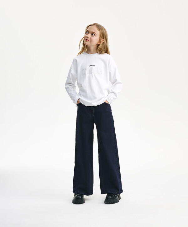 Синие джинсы силуэта палаццо – универсальная модель, которая легко впишется и в школьный, и в повседневный гардероб девочки. Джинсы выполнены из прочного и плотного хлопкового денима с эластаном. Спец... Показать описаниеиальная варка создала смягчающий эффект, наделив изделие легкой, еле заметной потертостью на швах, не препятствующей созданию образов в соответствии с школьным дресс-кодом. Они прекрасно сочетаются с деловым пиджаком и кардиганом, с блузкой и жилетом, с водолазкой и лонгсливом. Пять стандартных карманов делают джинсы для школы практичными и функциональными. Модная форма способствует их популярности среди девочек подросткового возраста.