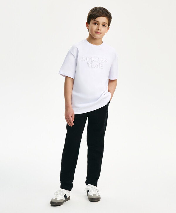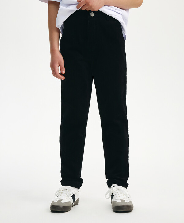 Черные вельветовые брюки прямого кроя – универсальная вещь, которая легко впишется и в повседневный, и в школьный гардероб мальчика. Лаконичный дизайн модели позволяет сочетать вельветовые школьные бр... Показать описаниеюки с любыми рубашками, водолазками, трикотажными пиджаками, создавая гармоничные образы в стиле смарт кэжуал(smart casual). Брюки выполнены из натурального хлопкового вельвета, который обладает мягкой текстурой и высокой износостойкостью. Эластан в составе ткани делает посадку брюк очень удобной для ребенка. Брюки имеют функциональные карманы со скосом на передней части. В оформлении модели использована лаконичная брендированная металлическая табличка. 97% хлопок,3% эластан