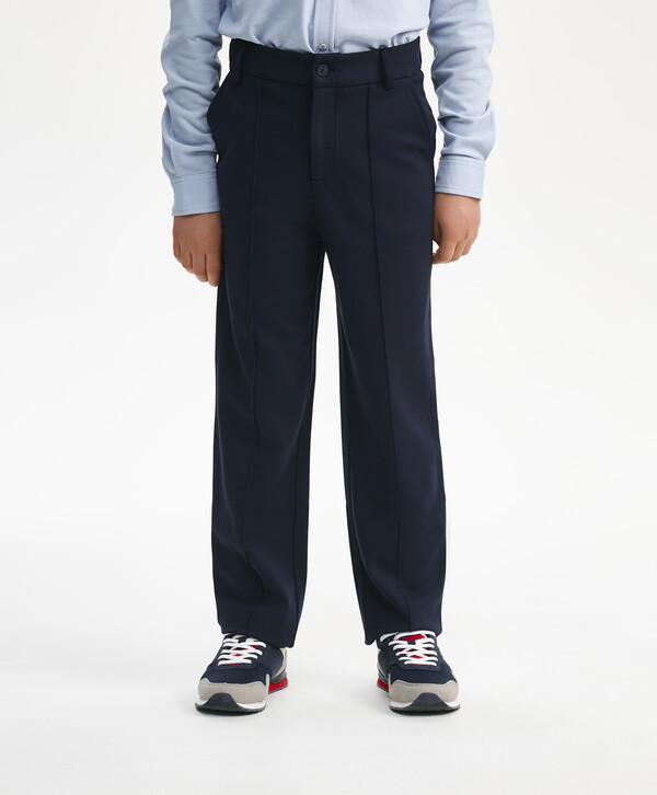 Синие трикотажные брюки – прекрасная альтернатива строгой классике! Брюки прямой формы выполнены из пластичного трикотажного полотна средней плотности, по внешнему виду и тактильным ощущениям максимал... Показать описаниеьно приближенного к текстилю. Они прекрасно держат форму и благодаря резинке на задней части пояса, очень комфортны в эксплуатации. Внутренняя часть брюк частично усилена шелковистой подкладкой. Брюки застегиваются на молнию и пуговицу, имеют удобные карманы со скосом, а также функциональные карманы-листочки на задних половинках. Синие школьные брюки легко комбинируются с рубашками и сорочками любого кроя, лонгсливами, джемперами, любыми изделиями из вязаного трикотажа и могут быть дополнены пиджаками и жилетам для создания образов, уместных на торжественных или официальных мероприятиях. верх 74% полиэстер,23% вискоза,3% эластан; подкладка 53% вискоза,47% полиэстер
