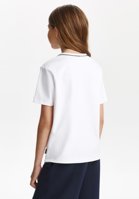 Белая футболка с коротким рукавом – прекрасный вариант для повседневных школьных образов девочки. Футболка выполнена из мягкого, гладкого, тактильно приятного мерсеризированного хлопкового интерлока. ... Показать описаниеСвободный крой, заниженная линия спинки, небольшие разрезы в боковых швах создают динамичный силуэт. Шрифтовой декор на передней части добавляет модели интересный модный акцент. Футболка прекрасно сочетается с юбками, брюками, джинсами любой формы, длины, цвета.