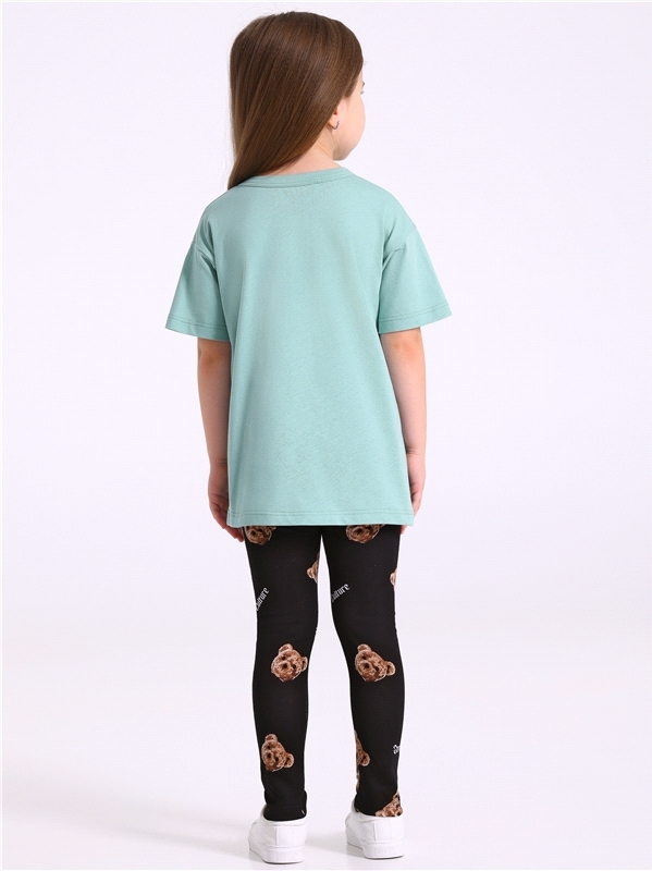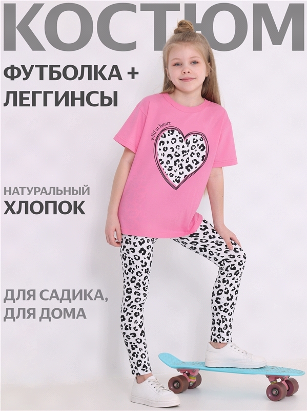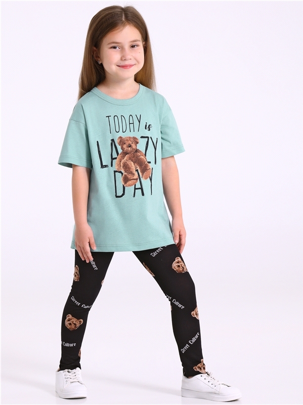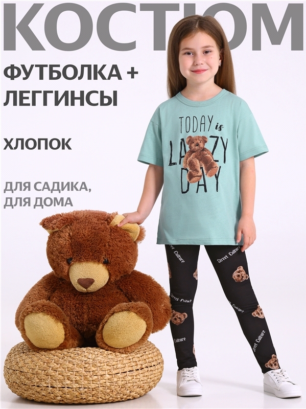 Комплект для девочки из футболки и леггинсов выполнен из кулира - легкого хлопкового полотна. Оверсайз футболка с короткими рукавами со спущенным плечом, украшена стильным принтом. Леггинсы на удобном... Показать описание эластичном поясе. Отличный выбор на каждый день! Уход: только машинная стирка (руками не стирать!) при температуре 40 градусов, без предварительного замачивания. Изделия с печатью и декором перед стиркой необходимо вывернуть на изнаночную сторону. Состав: кулир / хлопок 100%.