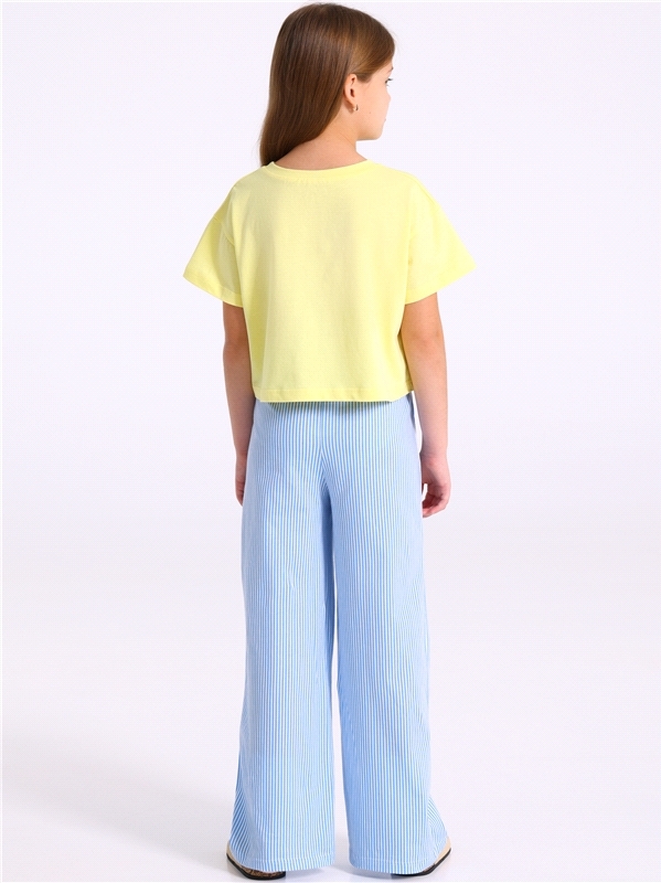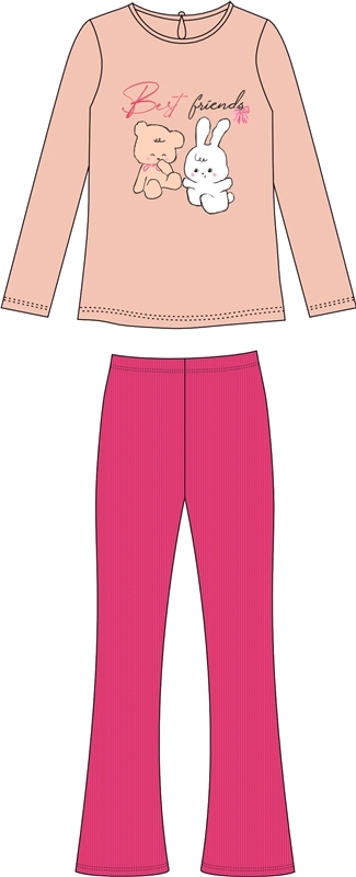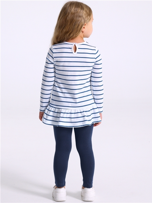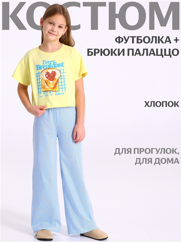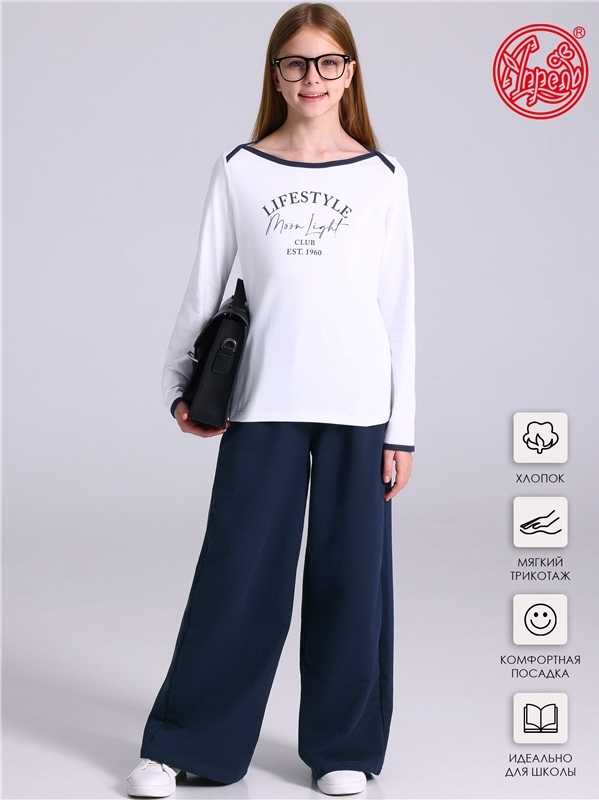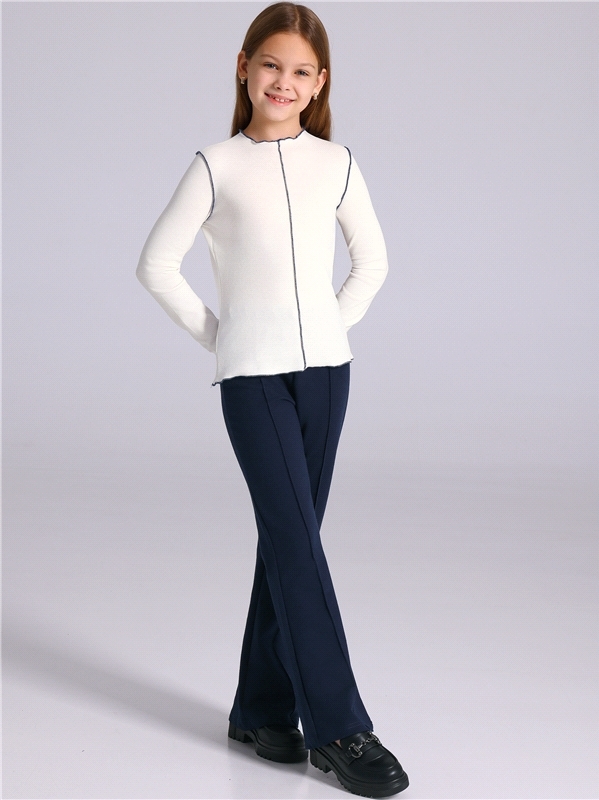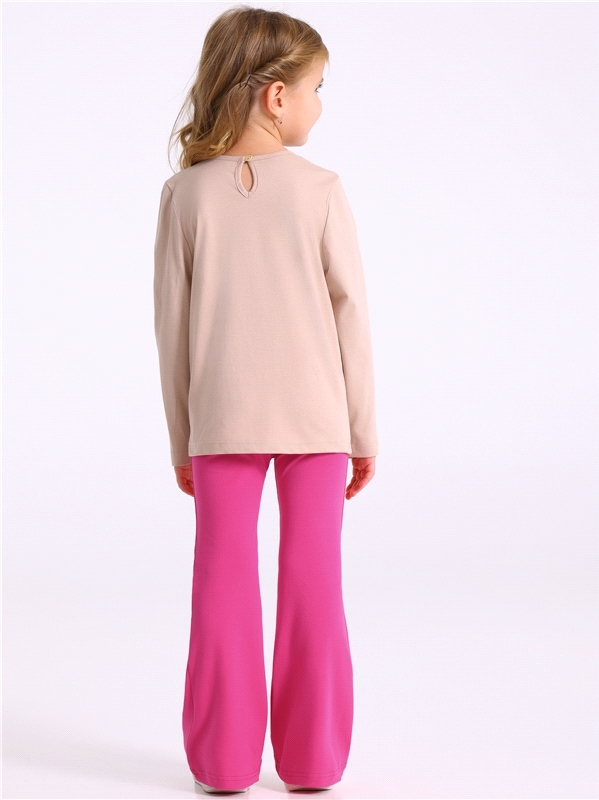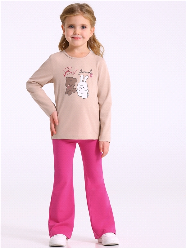 Костюм для девочки состоит из лонгслива и брюк. Лонгслив для девочки выполнен из кулира - легкого хлопкового плотна. Изделие прямого силуэта и свободного кроя, с длинными рукавами со спущенной линией ... Показать описаниеплеча, вырез горловины обработан эластичной бейкой из полотна компаньона. Брюки-клеш выполнены из ластика - эластичного хлопкового полотна в рубчик с добавлением лайкры. Изделие на комфортном эластичном поясе, клеш от колена. Уход: только машинная стирка (руками не стирать!) при температуре 40 градусов, без предварительного замачивания. Изделия с печатью и декором перед стиркой необходимо вывернуть на изнаночную сторону. Состав: / хлопок 100%, хлопок 92% + лайкра 8%.