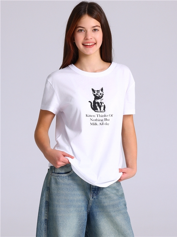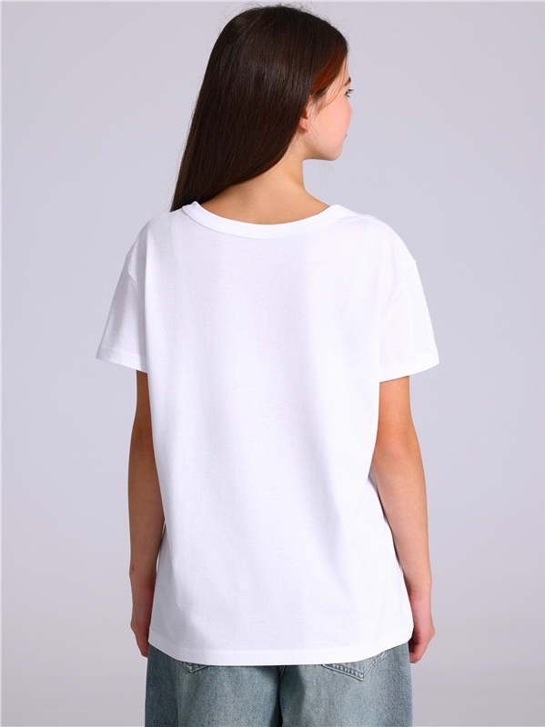 Футболка для девочки из кулира - легкого хлопкового полотна. Изделие с короткими рукавами со спущенным плечом, украшено печатью. Уход: только машинная стирка (руками не стирать!) при температуре 40 гр... Показать описаниеадусов, без предварительного замачивания. Изделия с печатью и декором перед стиркой необходимо вывернуть на изнаночную сторону. Состав: кулир / хлопок 100%.