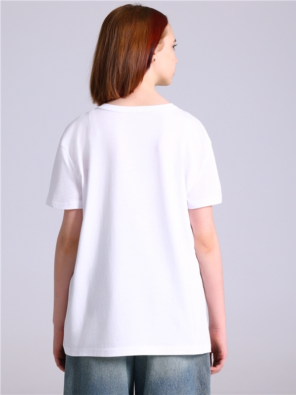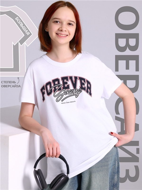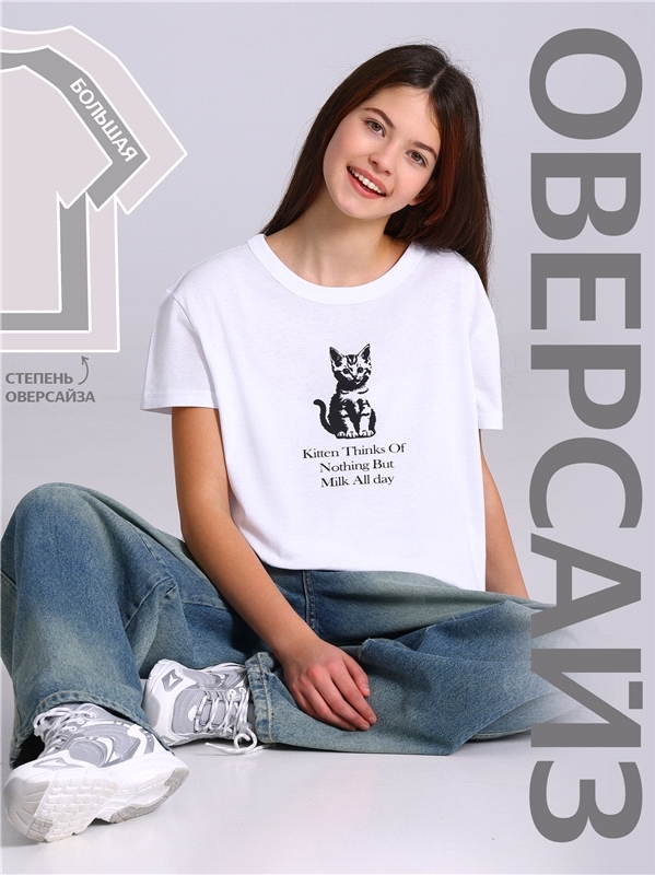 Оверсайз футболка для девочки выполнена из кулира - легкого хлопкового полотна. Изделие прямого покроя с короткими рукавами и круглым вырезом горловины, украшено печатью. Уход: только машинная стирка ... Показать описание(руками не стирать!) при температуре 40 градусов, без предварительного замачивания. Изделия с печатью перед стиркой необходимо вывернуть на изнаночную сторону. Состав: кулир / хлопок 100%.