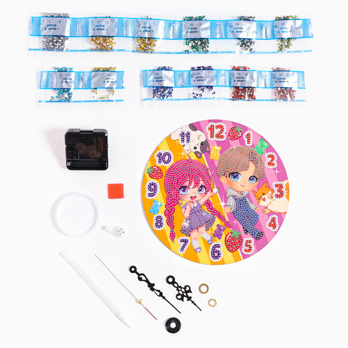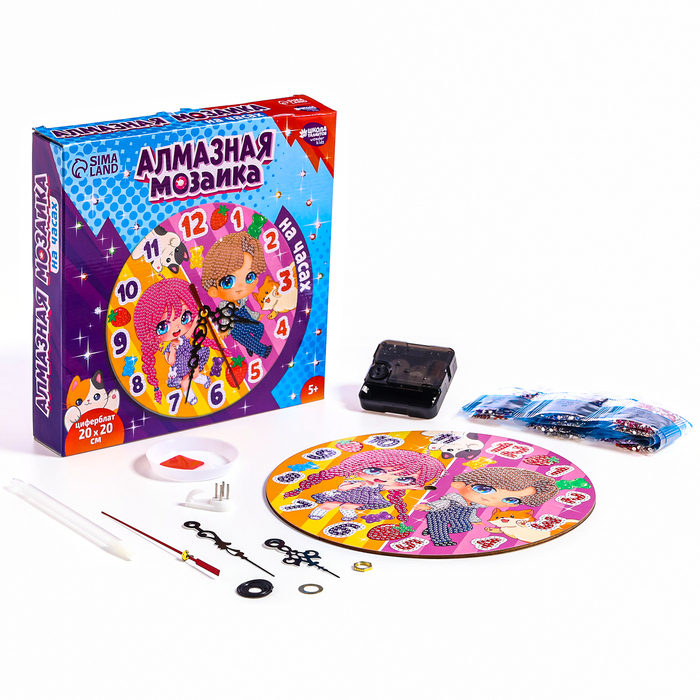 Алмазная мозаика — это увлекательный вид творчества, который понравится любому малышу! Ребёнку предстоит разложить кристаллики карандашом по пронумерованной схеме, заполнив всё полотно. Часики с клеев... Показать описаниеым покрытием будут надёжно удерживать стразы. Как создать мозаику 1. Для начала откройте небольшой участок схемы, приподняв и отогнув защитную плёнку. Не открывайте всю схему сразу. 2. Из пакетика с номером, который соответствует схеме, отсыпьте в ёмкость немного страз. 3. Возьмите специальный карандаш, окуните кончик в клеевую подушечку (розовый квадратик), возьмите страз. Таким образом заполните рисунок. 4. Соберите часовой механизм. Немного терпения, и сверкающие часики готовы! Комплектация * картонная основа * крючок * стразы * часовой механизм * поддон и клеевая подушечка * стилус