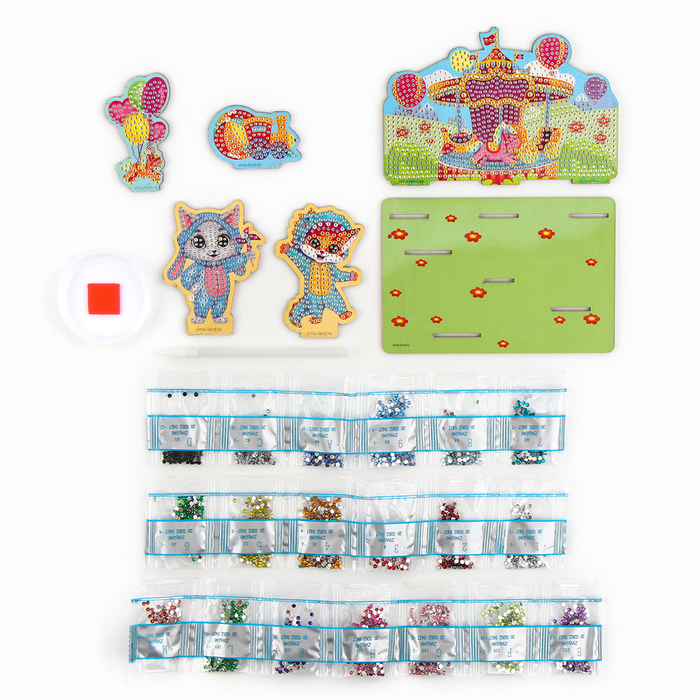 Алмазная мозаика на фигурках - это яркий и оригинальный набор для творчества! Мы поможем создать вам единственный в своем роде подарок на память, который будет храниться в течение многих лет! Создавай... Показать описаниете яркие композиции из страз вместе с ребенком. Такой вид творчества прекрасно успокаивает, способствует снижению стресса, а также развивает мелкую моторику. Как создать: * Откройте небольшой участок схемы, приподняв и отогнув защитный слой. * В таблице найдите номер, соответствующий символу на схеме и отсыпьте из пакетика с этим номером в ёмкость немного деталей. * Возьмите специальный карандаш и заполните его основание клеем, а затем возьмите им страз. * Повторите действия с остальными номерами. После того как вы наклеите все детали, поставьте все фигурки на подставки! Важно Стразы нужно выкладывать ровно, соблюдая ряды, иначе они будут отпадывать или выталкивать друг друга. Отклеивать защитный слой постепенно, небольшими участками, на которых вы собираетесь работать.