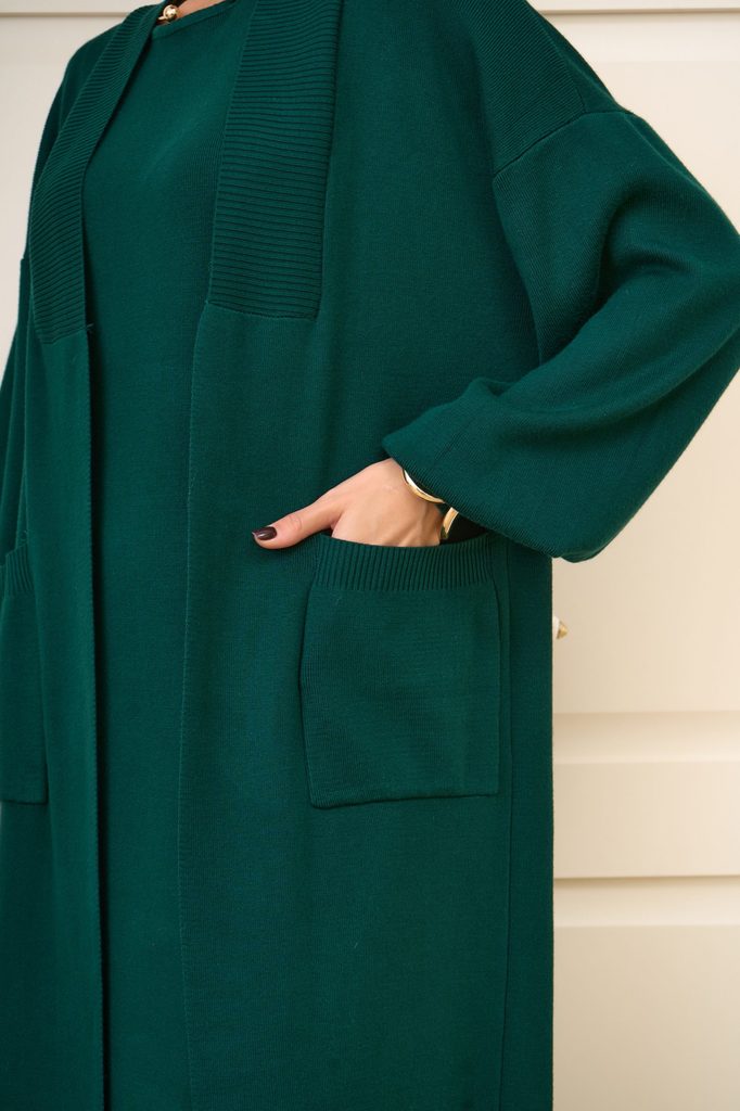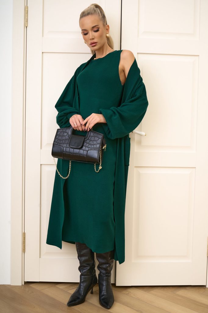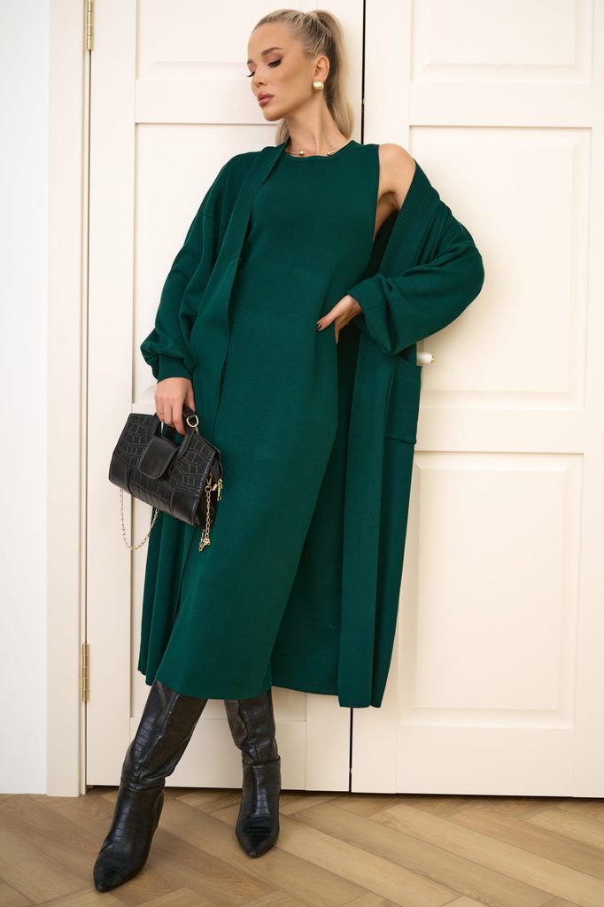 Состав: Шерсть – 70%, п/э – 20, хлопок – 10% Описание Элегантное платье-двойка в благородных оттенках. Лаконичное платье прямого кроя сочетается с удлинённым кардиганом на мягкой посадке. Образ подчер... Показать описаниекивает утончённость и создаёт эффект безупречной простоты. Универсальный комплект для офиса, деловых встреч и стильных выходов в город. Легко комбинируется с обувью на каблуке и аксессуарами в тон. Детали: Платье миди без лишних акцентов Кардиган свободного кроя с накладными карманами Длинный рукав с лёгким объёмом Материал: мягкий трикотаж высокого качества — приятен к телу, не теряет форму и сохраняет аккуратный вид. Этот комплект можно носить как вместе, так и по отдельности, создавая новые стильные комбинации каждый день. Длины: ( платье 117 см, кардиган 119 см).