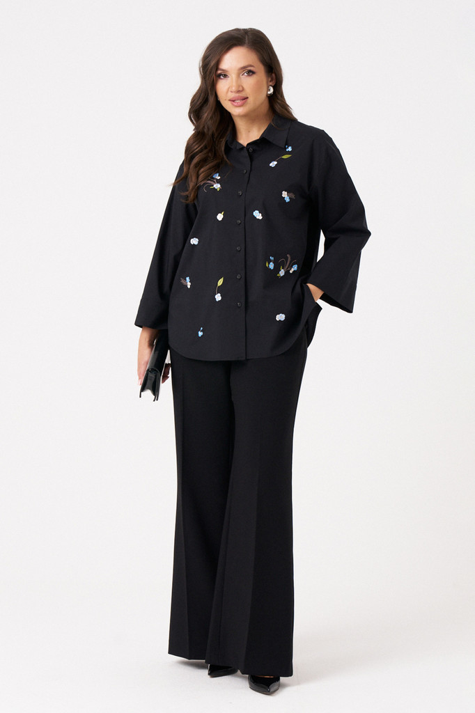Описание Это женская блузка чёрного оттенка из смесовой ткани с высоким содержанием хлопка, обеспечивающей комфорт и приятные тактильные ощущения. Модель выполнена с центральной бортовой застежкой, за... Показать описаниекрепленной на обметанных петлях и пуговицах, что придает ей классический и аккуратный вид. Перед украшен дизайнерской вышивкой в виде цветов, что добавляет изделию оригинальности и эстетической привлекательности. В боковых швах расположены небольшие разрезы, обеспечивающие свободу движений и удобство при носке. Горловина оформлена рубашечным воротником с отрезной стойкой, создавая структурированный и элегантный силуэт. Рукава втачные длинные, низ рукава обработан притачной манжетой, что делает дизайн завершенным и практичным. Эта блузка отлично подойдет для повседневных образов, сочетая комфорт, стиль и оригинальные декоративные элементы. Параметры Рост: 164 48 Блузка: Длина изделия - 68.5см, Длина рукава - 47.5см, Обхват шеи - 48см, Ширина плеча - 18см, Ширина по груди - 58.5см, Ширина по низу - 61.5см, Ширина рукава - 22.5см; 50 Блузка: Длина изделия - 68.5см, Длина рукава - 47.5см, Обхват шеи - 49см, Ширина плеча - 18.2см, Ширина по груди - 60.5см, Ширина по низу - 63.5см, Ширина рукава - 23см; 52 Блузка: Длина изделия - 69.5см, Длина рукава - 47.5см, Обхват шеи - 50.5см, Ширина плеча - 18.2см, Ширина по груди - 62.5см, Ширина по низу - 65.5см, Ширина рукава - 23.5см; 54 Блузка: Длина изделия - 70.5см, Длина рукава - 47.5см, Обхват шеи - 51см, Ширина плеча - 18.5см, Ширина по груди - 64.5см, Ширина по низу - 67.5см, Ширина рукава - 24см; 56 Блузка: Длина изделия - 70.5см, Длина рукава - 47.5см, Обхват шеи - 52см, Ширина плеча - 19см, Ширина по груди - 66.5см, Ширина по низу - 69.5см, Ширина рукава - 24.5см; 58 Блузка: Длина изделия - 71см, Длина рукава - 47.5см, Обхват шеи - 53см, Ширина плеча - 19см, Ширина по груди - 68.5см, Ширина по низу - 71.5см, Ширина рукава - 25см; Состав и уход Состав: Хлопок/cotton 70%; полиэстер/polyester 27%; эластан /elastane3%. Уход: * Стирка при температуре воды до 30°C * Не отбеливать * Гладить при температуре утюга до 110°C * Вертикальная сушка * Барабанная сушка запрещена * Профессиональная сухая чистка в тетрахлорэтилене и во всех растворителях, внесенных в список для символа F.