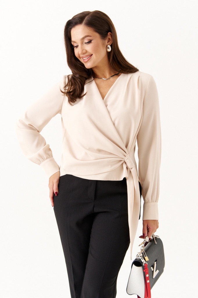 Описание Женская блузка из струящейся ткани бежевого цвета, идеально подходящая для повседневной носки. Модель выполнена на запах, что придаёт ей элегантность и удобство. Передняя часть украшена склад... Показать описаниеками в плечевом шве, а также дополнительными складками, образующимися за счёт передней детали, продеваемой через перемычку. Спинка имеет отрезную кокетку и небольшие складки для комфортной посадки. Горловина V-образная, подчёркивающая линию шеи. Рукава втачные, длинные. Низ рукава оформлен притачной манжетой с застёжкой на обмётанную петлю и пуговицу. Оригинальная и стильная блузка. Параметры Рост: 164 44 Блузка: Длина изделия по спинке - 60см, Длина рукава - 64см, Ширина плеча - 11.6см, Ширина по груди - 52см, Ширина по низу - 56см, Ширина рукава вверху - 17см, Ширина рукава внизу - 11.5см, Ширина спинки - 38см; 46 Блузка: Длина изделия по спинке - 60см, Длина рукава - 64см, Ширина плеча - 11.7см, Ширина по груди - 54см, Ширина по низу - 58см, Ширина рукава вверху - 17.5см, Ширина рукава внизу - 11.8см, Ширина спинки - 39см; 48 Блузка: Длина изделия по спинке - 60см, Длина рукава - 64см, Ширина плеча - 11.8см, Ширина по груди - 56см, Ширина по низу - 60см, Ширина рукава вверху - 18см, Ширина рукава внизу - 12см, Ширина спинки - 39.6см; 50 Блузка: Длина изделия по спинке - 61см, Длина рукава - 64см, Ширина плеча - 12см, Ширина по груди - 58см, Ширина по низу - 62см, Ширина рукава вверху - 19см, Ширина рукава внизу - 12.3см, Ширина спинки - 40.5см; 52 Блузка: Длина изделия по спинке - 62см, Длина рукава - 64см, Ширина плеча - 12см, Ширина по груди - 60см, Ширина по низу - 64см, Ширина рукава вверху - 20см, Ширина рукава внизу - 12.5см, Ширина спинки - 41.2см; 54 Блузка: Длина изделия по спинке - 63см, Длина рукава - 64см, Ширина плеча - 12.2см, Ширина по груди - 62см, Ширина по низу - 66см, Ширина рукава вверху - 20.5см, Ширина рукава внизу - 13см, Ширина спинки - 42см; Состав и уход Состав: Полиэстер 65%; вискоза 32%; эластан 3%. Уход: * Стирка при температуре воды до 30°C * Не отбеливать * Гладить при температуре утюга до 110°C * Вертикальная сушка * Барабанная сушка запрещена * Профессиональная сухая чистка в тетрахлорэтилене и во всех растворителях, внесенных в список для символа F.