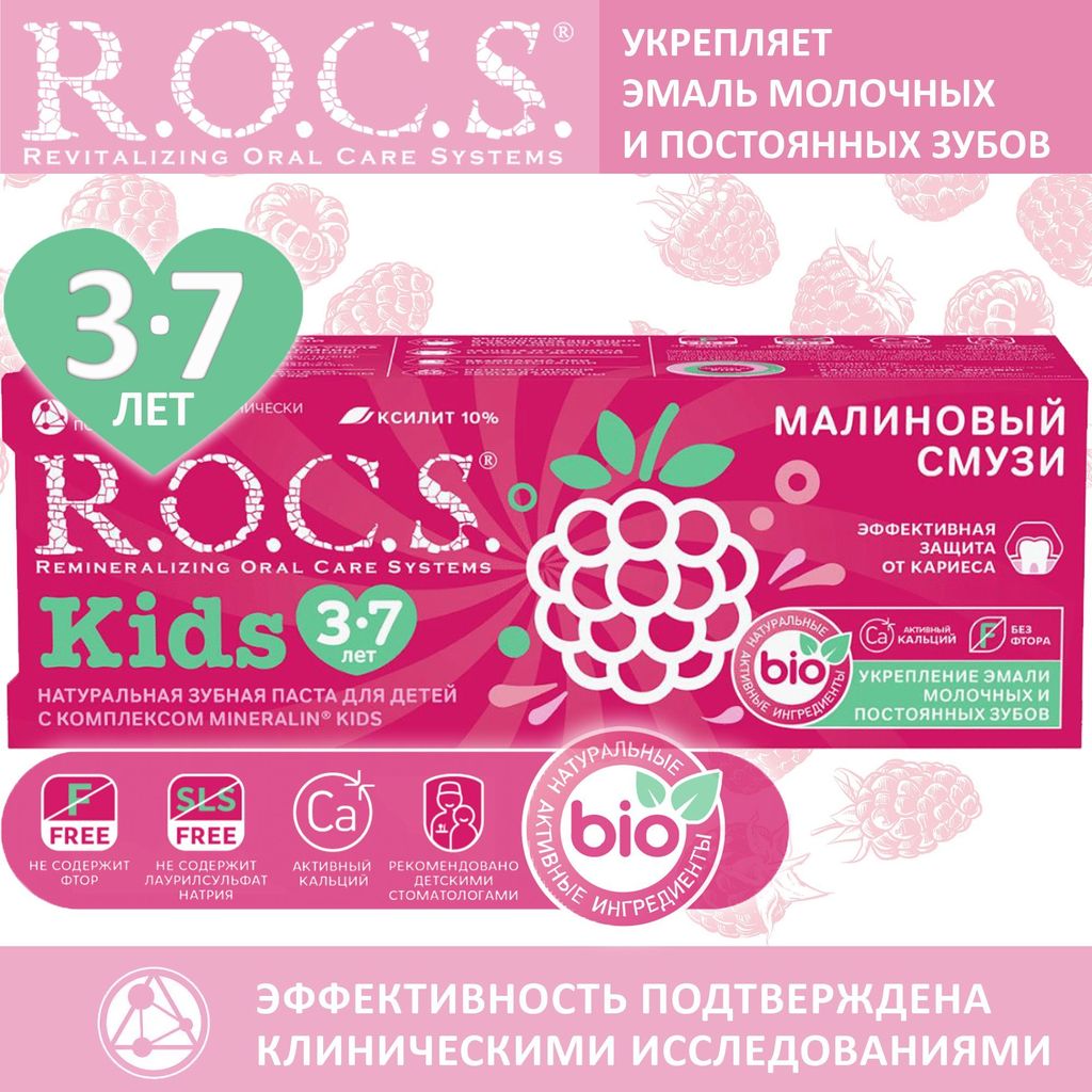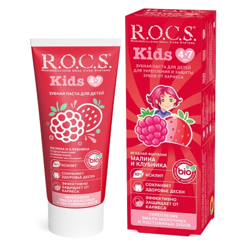 Правильная гигиена полости рта важна с ранних лет жизни, но многие родители знают, насколько сложно приучить маленького ребенка ежедневно чистить зубы. Именно для таких ситуаций разработана эффективна... Показать описаниея зубная паста для детей R.O.C.S. Kids «Малина и Клубника». Паста зубная R.O.C.S. Kids «Малина и Клубника» сочетает в себе уникальный набор полезных микроэлементов и необычный ягодный вкус. Паста ориентирована на детей в возрасте от 4 до 7 лет и разработана при участии стоматологов. Она учитывает возрастные особенности ребенка, имеет богатый компонентный состав и, благодаря приятному популярному вкусу малины и клубники, помогает мотивировать ребенка на регулярную чистку зубов. Показания к применению Использование зубной пасты R.O.C.S. Kids «Малина и Клубника» рекомендовано детям от 4 до 7 лет. В этом возрасте рацион ребенка, как правило, включает сравнительно большое количество сладостей, газированную воду и т.д. Дети дошкольного возраста любят разгрызать жесткие карамельные конфеты, не равнодушны к орешкам, чипсам и прочим подобным лакомствам, но, часто, не склонны выполнять гигиену полости рта. При этом, нежная эмаль молочных зубов не рассчитана на такие нагрузки. Зубная паста для детей R.O.C.S. Kids «Малина и Клубника» обеспечивает эффективную гигиену ротовой полости, защищает нежную эмаль от растворяющего действия кислот, предохраняет зубы от кариеса, обеспечивает бережный уход за деснами. Уникальный состав пасты содержит активные вещества, создающие защитный слой в максимально короткие сроки, что весьма важно, поскольку дети крайне редко выдерживают время (3 минуты), рекомендованное для чистки зубов. Отсутствие в составе лаурилсульфата натрия, позволяет мспользовать эту пасту детям, склонным к аллергии Положительный эффект Высокая эффективность зубной пасты R.O.C.S. Kids со вкусом «Малина и Клубника» обусловлена уникальным компонентным составом. Комплекс AMIFLUOR®, содержащий высокую концентрацию ксилита и аминофторид Olafluor 500 ppm: обеспечивает устойчивость зубной эмали к растворяющему действию кислот; надежно защищает десны от воспаления; защищает зубы от кариесогенных бактерий; нормализует микрофлору полости рта; обеспечивает профилактику потери эмалью зубов фосфора и кальция; способствует интенсивному насыщению поверхности зубов минералами; подходит для детей, склонных к аллергии. Использование данной пасты обеспечивает бережное удаление зубного налета (низкоабразивная формула RDA=45) и быстрое (в течение всего 20 секунд) формирование защитного высокостабильного слоя на поверхности зубов, благодаря чему достигается необходимый уровень гигиены даже при минимальном времени воздействия (чистка зубов по продолжительности меньше 3 минут).