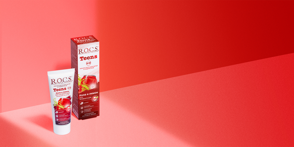 Зубная паста R.O.C.S. Teens «Вкус активного дня. Кола и лимон» разработана специально для детей и подростков от 8 до 18 лет. Обеспечивает качественную гигиену и защиту десен, нормализует микрофлору по... Показать описаниелости рта. Повышает устойчивость эмали к кислотам. Эффективна в профилактике кариеса благодаря фториду натрия в составе. Способствует глубокой реминерализации эмали. Обладает насыщенным ароматом колы, который делает процесс чистки приятным для ребенка. R.O.C.S. — яркий вкус сияющей улыбки! Рекомендации к применению Рекомендуем чистить зубы 2 раза в день в течение 2-3 минут. Не ополаскивайте рот и воздержитесь от приема пищи и напитков в течение 30-40 минут. Используйте для чистки вертикальные выметающие или круговые движения, избегайте горизонтальных движений вдоль линии десны. Рекомендуем использовать совместно с зубной щеткой R.O.C.S. Teens для детей и подростков от 12 до 18 лет. Помогайте дочищать зубы ребенку до 8-10 лет, чтобы сформировать правильные навыки чистки.