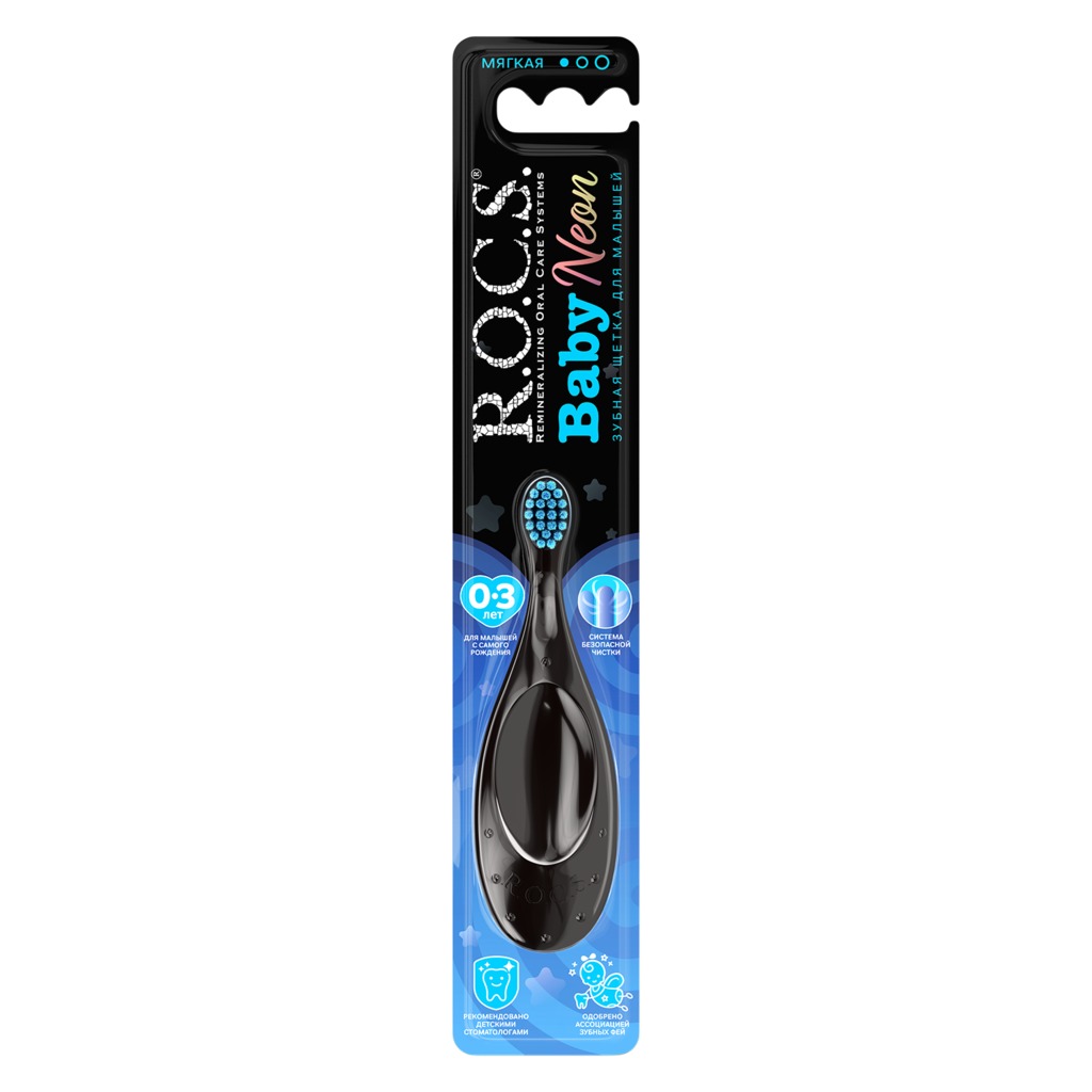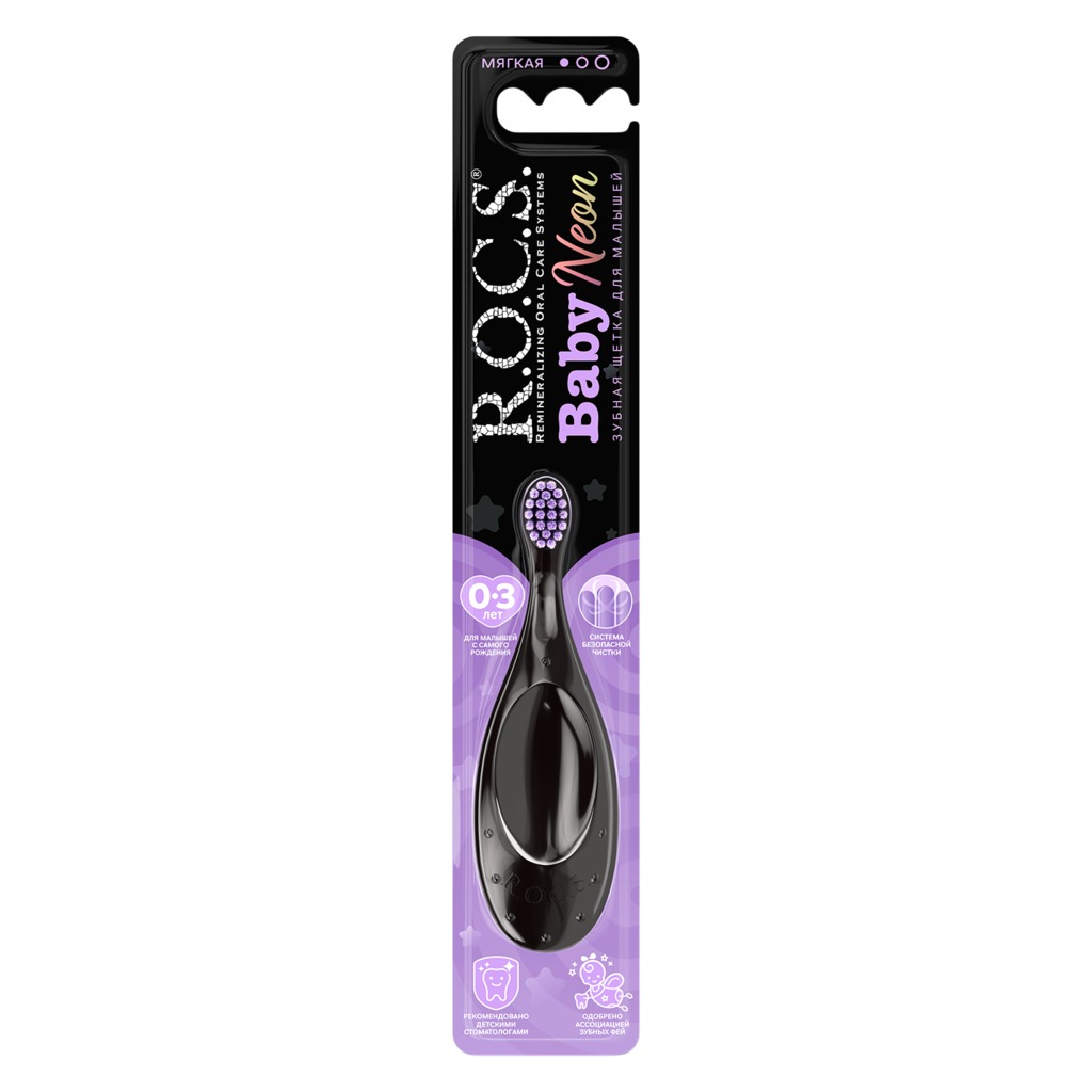 Зубная щетка R.O.C.S. Baby Neon — отличное решение для ежедневной гигиены полости рта малышей от 0 до 3 лет. Экстрамягкая щетина с уникальной технологией тройной полировки кончиков исключает возможнос... Показать описаниеть повреждения твердых тканей или десен. Широкая ручка-кусалка, выполненная из прочного гладкого пластика, препятствует слишком глубокому проникновению в полость рта и травмированию мягких тканей. Эффективно очищает зубы от мягкого налета. Представлена в стильном минималистичном дизайне с четырьмя яркими цветовыми вариантами щетины. R.O.C.S. — c детства на всю жизнь! Рекомендации к применению После прорезывания первых жевательных зубов рекомендуем использовать небольшое количество зубной пасты Baby совместно с зубной щеткой R.O.C.S. Baby для детей от 0 до 3 лет. Используйте для чистки круговые, выметающие движения от десны без надавливания. Чистка зубов малыша — ответственность родителей. Помогайте чистить зубы и прочищать труднодоступные участки до 10-12 лет, пока у ребенка не сформируется почерк. Это позволит сформировать правильные навыки чистки. Перед началом эксплуатации, а также после каждого использования зубную щетку необходимо тщательно промывать в теплой проточной воде. Хранить зубную щетку рабочей частью вверх отдельно от щеток членов вашей семьи. Рекомендуется менять зубную щетку раз в 3 месяца или раньше при раннем износе щетины, а также после перенесенных инфекционных заболеваний.