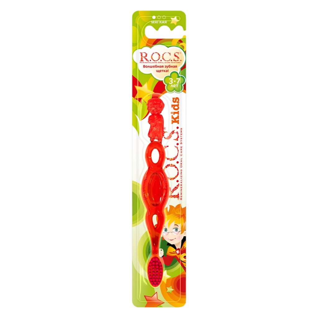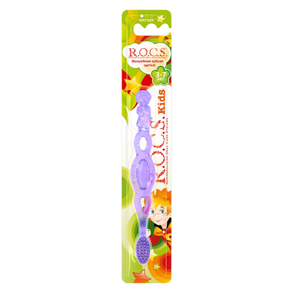 Зубная щетка R.O.C.S. Kids станет отличным помощником в качественной гигиене полости рта детей от 3 до 7 лет. Мягкая щетина с уникальной тройной полировкой кончиков обеспечивает бережный уход за зубам... Показать описаниеи, не повреждая нежные десны и незрелую эмаль ребенка. Уникальная форма ручки, выполненная в форме волшебной палочки с фигуркой героя на кончике, превратит чистку зубов в увлекательную игру и повысит мотивацию к ежедневной гигиене. Способствует деликатному массажу десен, качественно и мягко удаляет зубной налет и очищает промежутки между зубами. Представлена в четырех ярких цветовых вариантах. R.O.C.S. — с детства вместе! Рекомендации к применению Рекомендуем применять 2 раза в день в течение 2 минут. Используйте для чистки вертикальные выметающие или круговые движения, избегайте горизонтальных движений вдоль линии десны. Помогайте чистить зубы и прочищать труднодоступные участки до 10-12 лет. Это позволит сформировать правильные навыки чистки. Перед началом эксплуатации, а также после каждого использования зубную щетку необходимо тщательно промывать в теплой проточной воде. Хранить зубную щетку рабочей частью вверх отдельно от щеток членов вашей семьи. Рекомендуется менять зубную щетку раз в 3 месяца или раньше при раннем износе щетины, а также после перенесенных инфекционных заболеваний. Цвет в ассортименте.