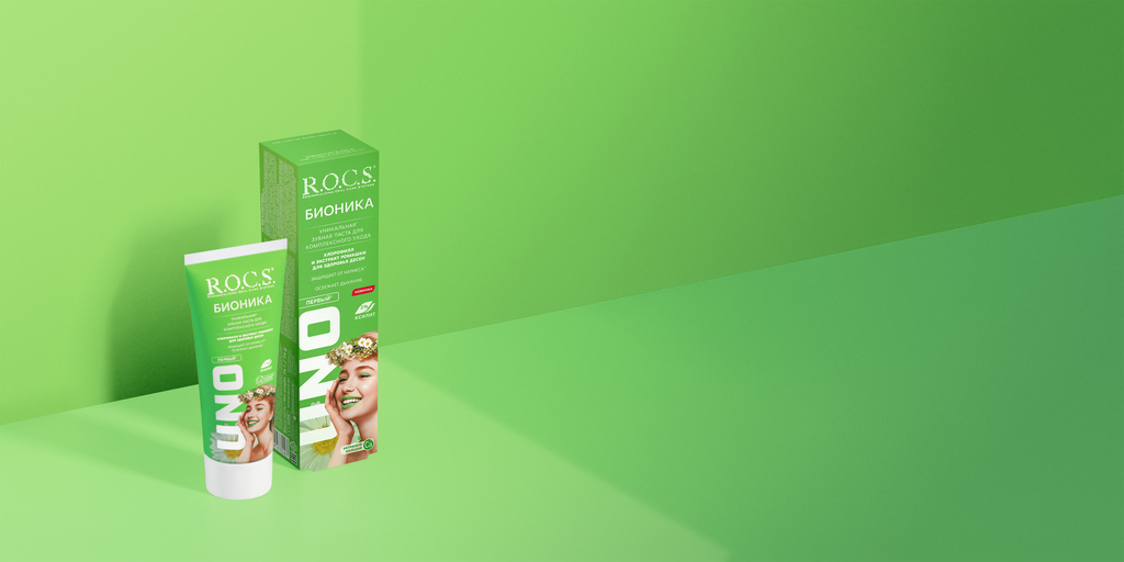 Уникальная зубная паста R.O.C.S. UNO BIONICA (БИОНИКА) – результат многолетних исследований в области минерального обмена зубов. Она содержит инновационный запатентованный комплекс микроэлементов, кот... Показать описаниеорые обеспечивают насыщение зубов фосфором и кальцием, укрепляя и восстанавливая эмаль (в том числе, в постпломбировочный период). Кроме этого, паста обеспечивает комплексный всесторонний уход за полостью рта: укрепляет десны, успешно борется с образованием зубного налета, защищает от кариеса, придает дыханию длительную свежесть. Хлорофилл и экстракт ромашки улучшают состояние десен, защищают от патогенных бактерий, а так же содержит бишофит для комплексного ухода за зубами и деснами. Обладает насыщенным вкусом освежающей мяты с ароматом лесных ягод. Основными компонентами зубной пасты R.O.C.S. UNO BIONICA (БИОНИКА) являются ксилит (2,2%), хлорофилл и активный биологически доступный комплекс минералов. Такой состав обуславливает высокий положительный эффект от использования пасты. Крепкие зубы, здоровые десны и уверенность в свежести дыхания – залог сияющей улыбки от R.O.C.S.! Рекомендации к применению Рекомендуем чистить зубы 2 раза в день в течение 2-3 минут. Не ополаскивайте рот и воздержитесь от приема пищи и напитков в течение 30-40 минут. Используйте для чистки вертикальные выметающие или круговые движения, избегайте горизонтальных движений вдоль линии десны. Для лучшей гигиены полости рта рекомендуем использовать совместно с ополаскивателем R.O.C.S. Активный магний.