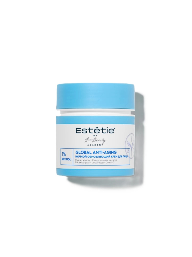 Бренд ESTETIE - экспертная косметика нового поколения, где наука встречается с природой, с клинически доказанной эффективностью от Bio Beauty Academy. Волшебство науки и сила природы для красоты Вашей... Показать описание кожи от лучших экспертов. Estétie - это не просто уход, это философия. Каждое средство Estétie проходит тестирование и подтверждает свою эффективность под контролем дерматологов и трихологов. Каждое средство Estétie - это не просто уход, а ежедневный ритуал заботы о себе, комфортный даже для чувствительной кожи. ESTETIE КРЕМ ДЛЯ ЛИЦА НОЧНОЙ ОБНОВЛЯЮЩИЙ GLOBAL ANTI-AGING - активная формула на основе 1% ретинола разработана специально для обновления клеток кожи в ночное время. Внешний вид и свойства: эмульсия белого цвета с фантазийным ароматом Благодаря ускоренной регенерации морщины становятся менее заметными, а тон лица - более ровным. Гиалуроновая кислота обеспечивает глубокое многоуровневое увлажнение, а муцин улитки ускоряет регенерацию. Трипептид меди стимулирует синтез коллагена и активное восстановление клеток кожи. Ресвератрол - мощный антиоксидант - защищает клетки от повреждений, замедляя старение, а церамиды и омега-3 поддерживают гидролипидный барьер, необходимый для защиты кожи в течение дня. Специальные особенности: гипоаллергенно Результат: кожа увлажнена и напитана