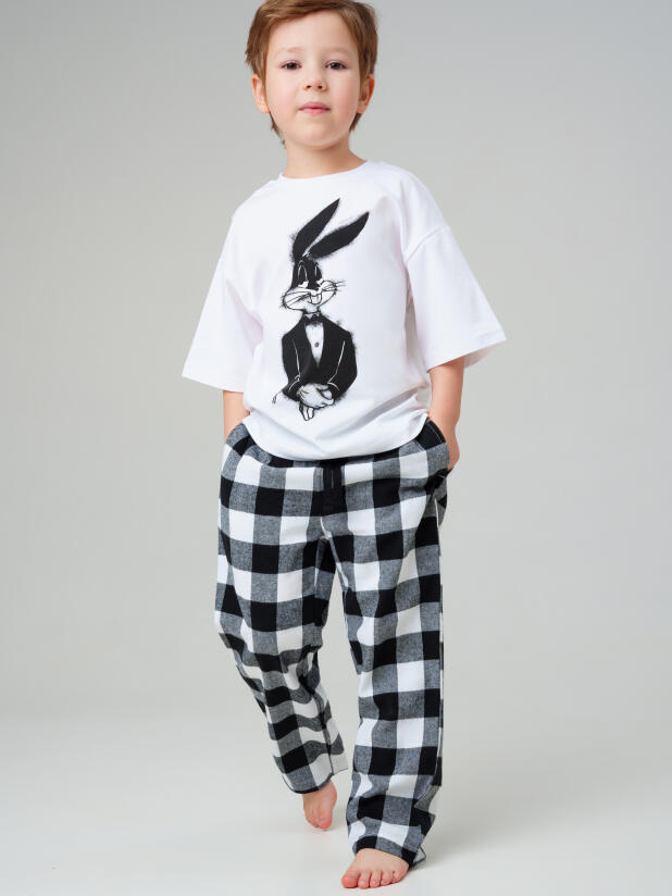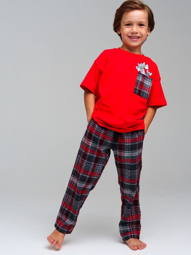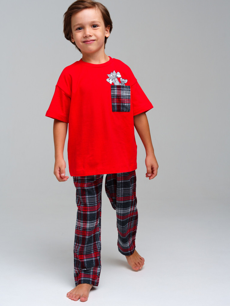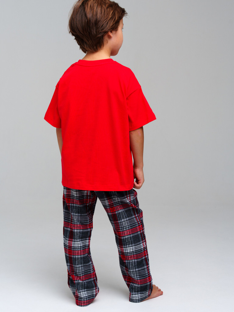 Детская пижама оверсайз для мальчика от PlayToday — комплект из футболки с короткими рукавами и брюк в крупную клетку. Практичный дизайн, удобная посадка и натуральные материалы делают её идеальной дл... Показать описаниея сна, дома и отдыха. Особенности модели: + брюки на резинке со шнурком — легко регулируются, обеспечивают комфортную посадку + два кармана на брюках — практичное и удобное решение + фланелевые брюки с микроначёсом — тёплые, мягкие и уютные, отлично подходят для прохладных ночей + футболка из хлопкового трикотажа — приятная к телу, дышащая ткань для здорового сна + стильный клетчатый принт на брюках — модное решение для мальчиков от 3 до 7 лет + свободный крой — не сковывает движений и позволяет ребёнку чувствовать себя комфортно во сне и во время игр дома Преимущества: Пижама PlayToday сочетает удобство и стиль. Брюки из текстиля с микроначёсом дарят тепло и мягкость, а футболка из хлопкового трикотажа обеспечивает воздухообмен и комфорт в любое время года. Такая детская пижама подходит не только для сна, но и как домашний костюм для игр и отдыха. Совет по стилю: Рубашку можно носить отдельно — она отлично смотрится с джинсами или спортивными штанами PlayToday, а клетчатые брюки подойдут к любым базовым футболкам. Таким образом, пижама легко трансформируется в повседневный домашний комплект. Размеры: модель доступна для роста 98, 104, 110, 116 и 122 см — подходит для мальчиков от 3 до 7 лет. Модная клетчатая пижама для мальчика из хлопка с микроначёсом от PlayToday — комфортная и стильная одежда для сна и дома.