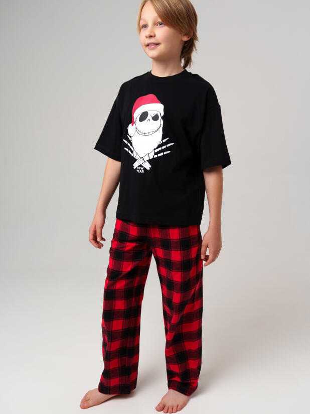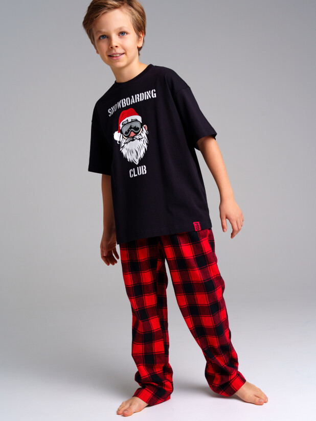Стильная подростковая пижама для мальчика от PlayToday — удобный комплект для сна и дома, состоящий из футболки и текстильных брюк в клетку. Такая пижама сочетает комфорт, современный дизайн и практич... Показать описаниеность для школьников и подростков. Преимущества модели: хлопковая футболка с принтом — дышащая, мягкая и приятная к телу брюки из текстиля с микроначёсом — сохраняют тепло и дарят уют в прохладное время пояс на резинке со шнурком — регулируемая посадка и комфорт в носке два кармана — практичное решение для дома свободный крой — не стесняет движений и подходит для активного ребёнка Когда и как носить: Пижама идеально подойдёт для сна дома, отдыха на даче, поездок к друзьям или гостевых ночёвок. Благодаря стильному дизайну её можно использовать и как домашний костюм для мальчиков. Совет по стилю: Сочетайте пижаму с мягкими тапочками и халатом PlayToday, чтобы создать уютный домашний образ. Размеры: 128–176 см — подходят мальчикам подросткам от 8 лет и старше, для младших и старших школьников. Стильная пижама для мальчиков от PlayToday — комфорт, тепло и современный дизайн на каждый день.